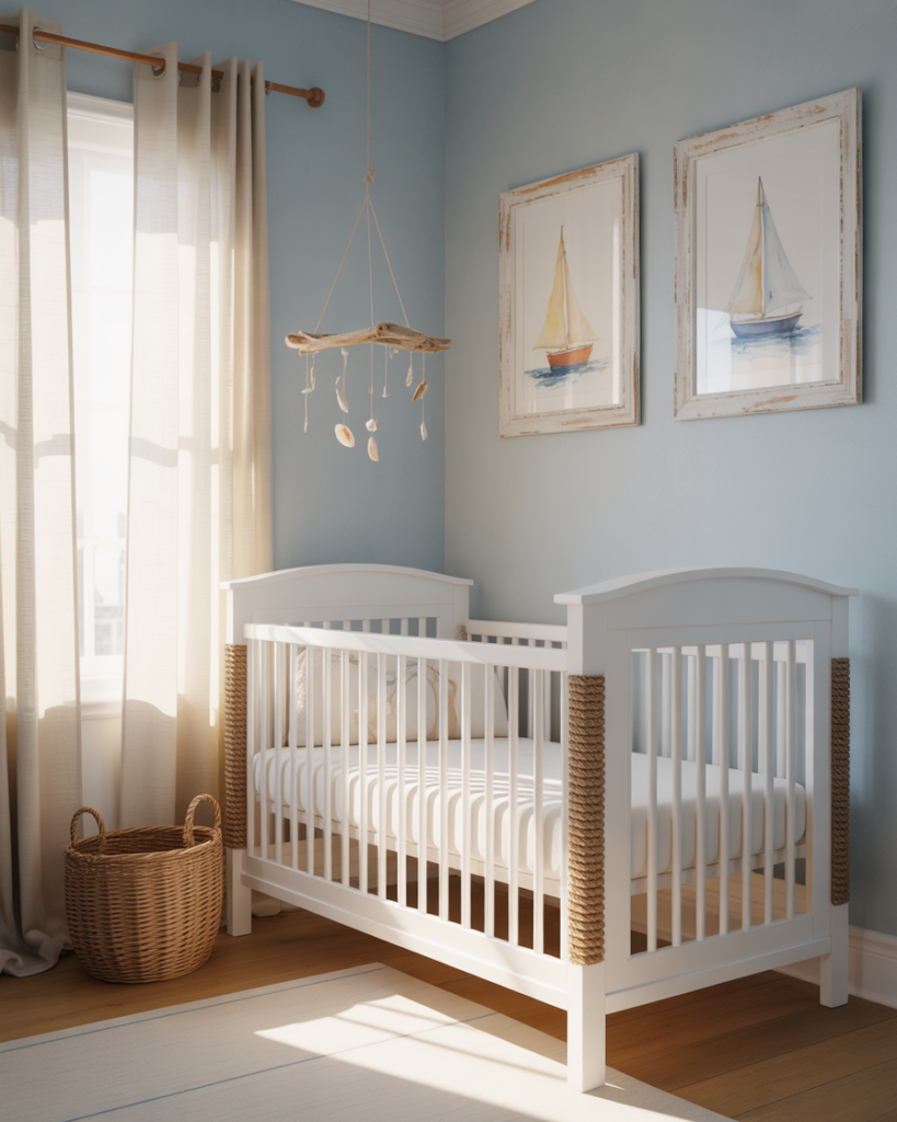 A beachy nursery captures relaxed coastal living with natural textures, ocean-inspired colors, and breezy simplicity. Soft blues, sandy neutrals, and weathered whites create an easy, laid-back atmosphere. This theme extends beyond literal ocean elements to embrace the overall coastal lifestyle—think linen curtains, rope accents, and driftwood rather than anchors and surfboards. It’s particularly popular in coastal regions but translates beautifully anywhere parents want to evoke vacation-home serenity.