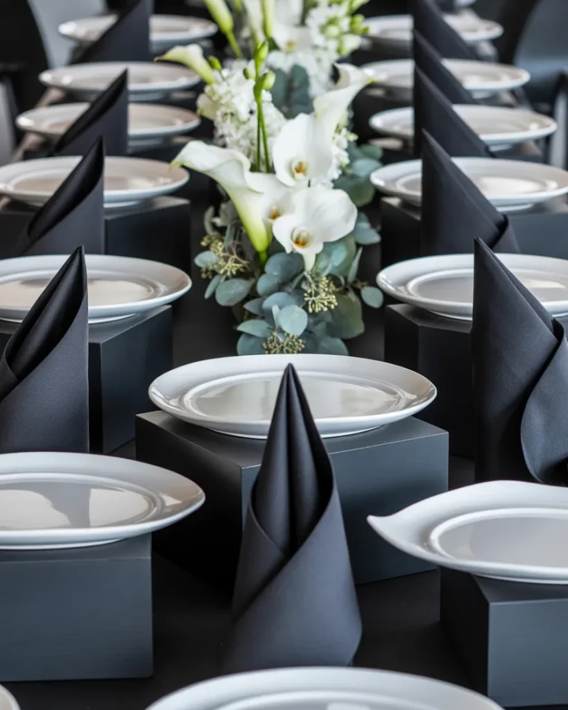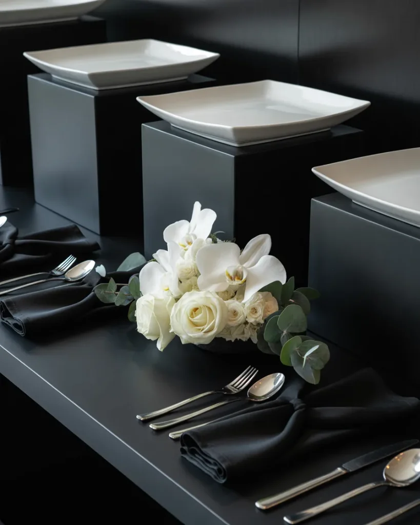 For corporate events or sophisticated private parties, a monochromatic black and white buffet display table delivers maximum visual impact with minimal color risk. Matte black risers, white ceramic platters, black linen napkins folded precisely, and a single architectural floral arrangement in white blooms create something that feels closer to editorial styling than a food table. This approach photographs spectacularly and reads as high-end regardless of what the food itself looks like.