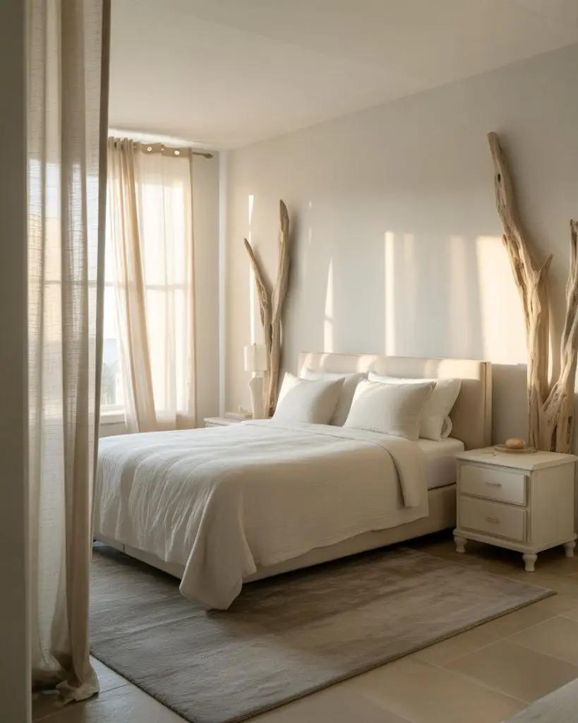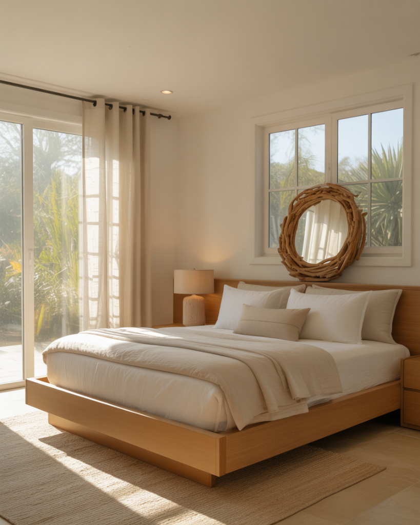 Minimalist coastal design thrives on a foundation of warm beige, taupe, and sand tones that mimic the natural colors of a quiet beach at dawn. In a Master suite, this translates to a low-profile bed frame in light wood, organic cotton bedding in oatmeal and cream, and textured accents like a chunky knit throw or linen Roman shades. The absence of bold color creates a meditative atmosphere, ideal for winding down after long days. A single piece of driftwood art or a ceramic vase in matte white completes the look without adding visual noise.
