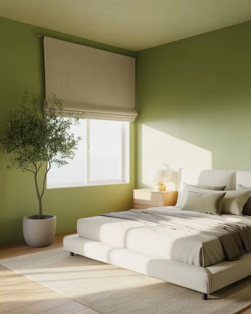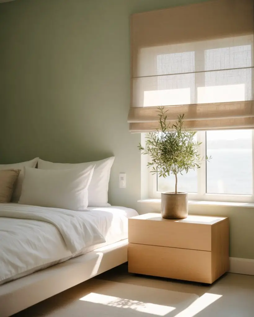 A Green and White Minimalist palette channels the quiet of coastal marshlands and dune grasses, creating a bedroom that feels restorative and uncluttered. Picture walls in a soft eucalyptus or celery green, crisp white bedding, and minimal furniture in light wood or painted white. A single piece of greenery—a potted olive tree or monstera—provides a living focal point, while a simple linen shade at the window filters light beautifully. The room breathes, with plenty of negative space and a focus on quality over quantity.
