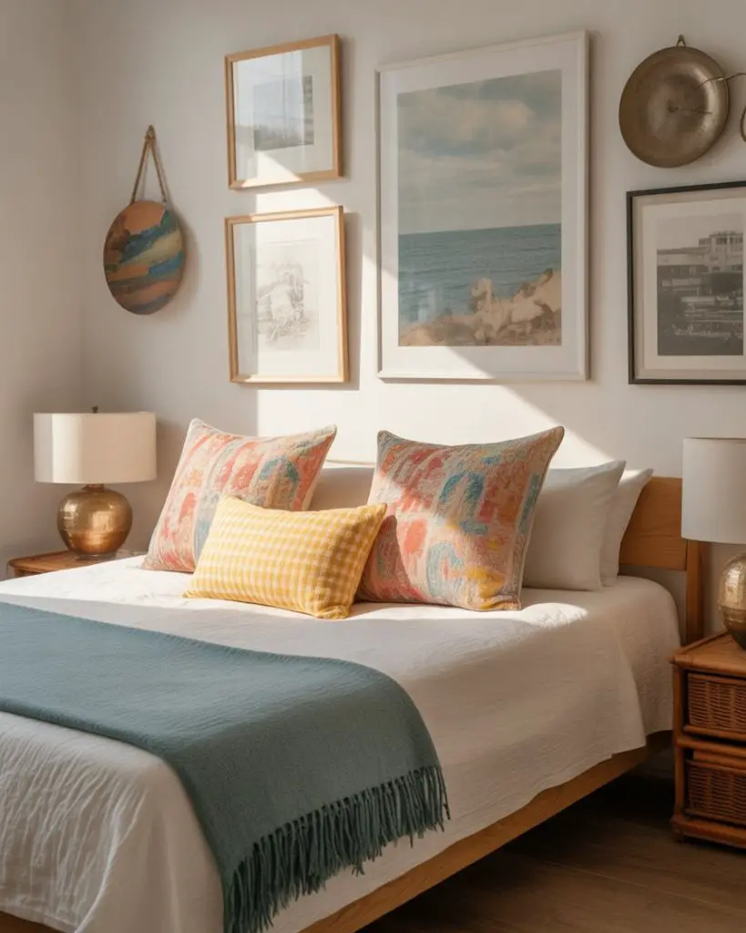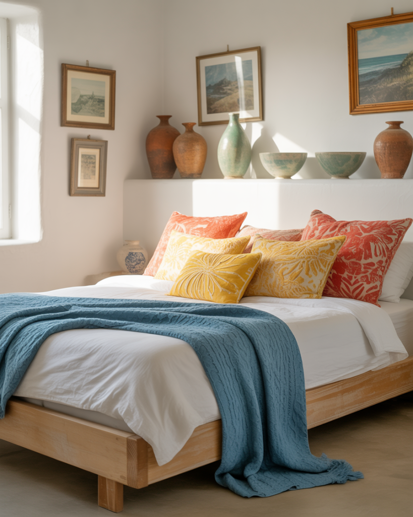 For those who find traditional coastal palettes too subdued, a Colorful Eclectic bedroom offers a vibrant alternative. Layer saturated blues, coral pinks, sunny yellows, and ocean greens across bedding, artwork, and accessories, unified by a neutral backdrop—white walls, natural wood floors, or linen curtains. The trick is balancing intensity: use colorful patterns in smaller doses (pillows, a throw, a piece of art) and let larger elements remain calm. Vintage finds, global textiles, and handmade ceramics add character and prevent the space from feeling too matchy.