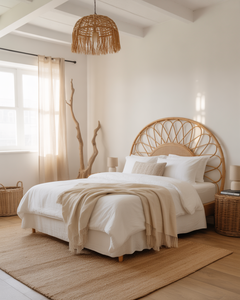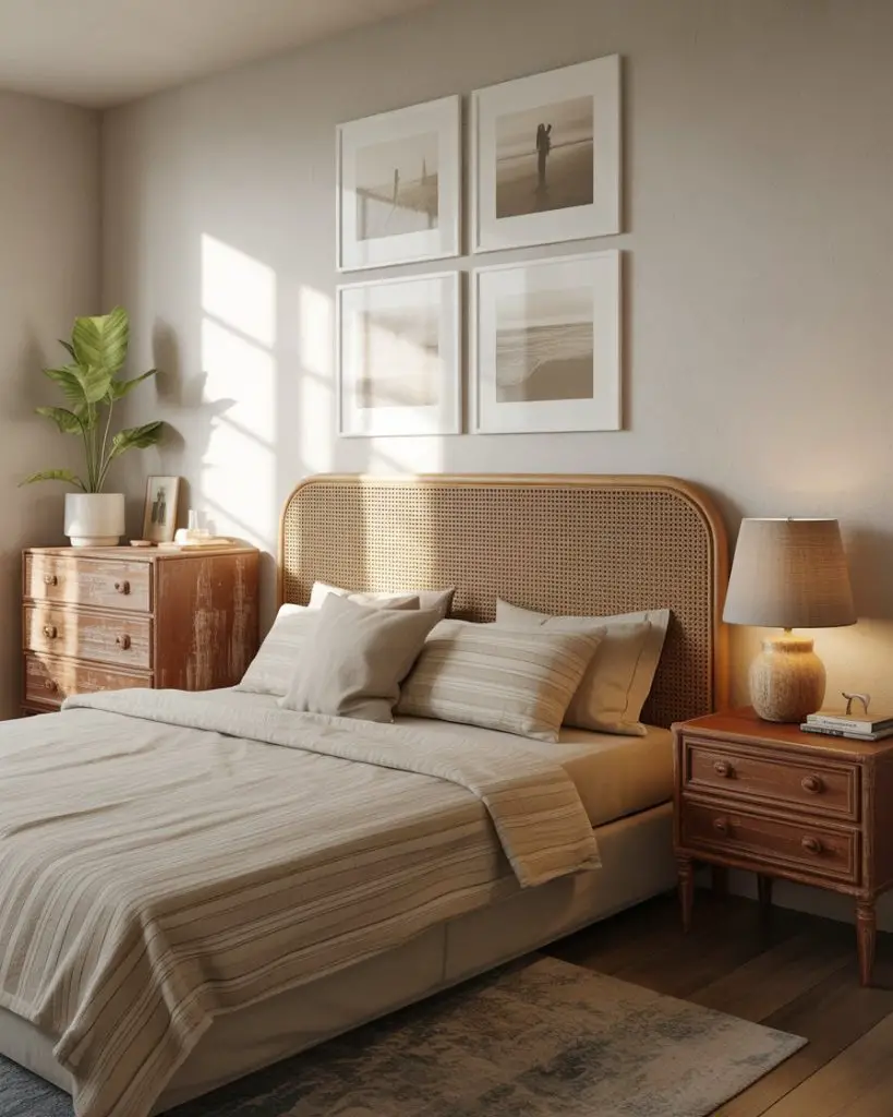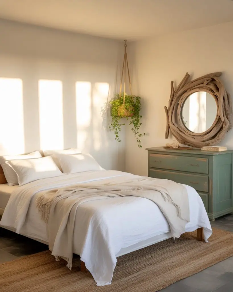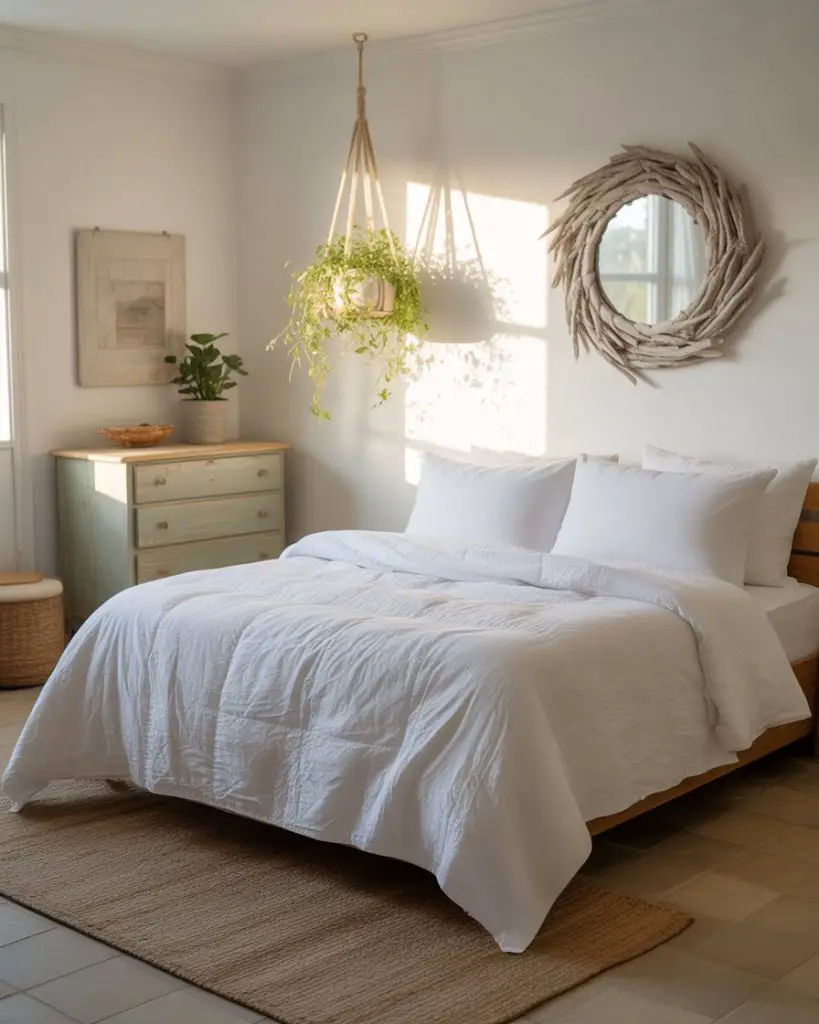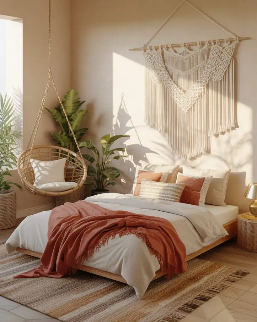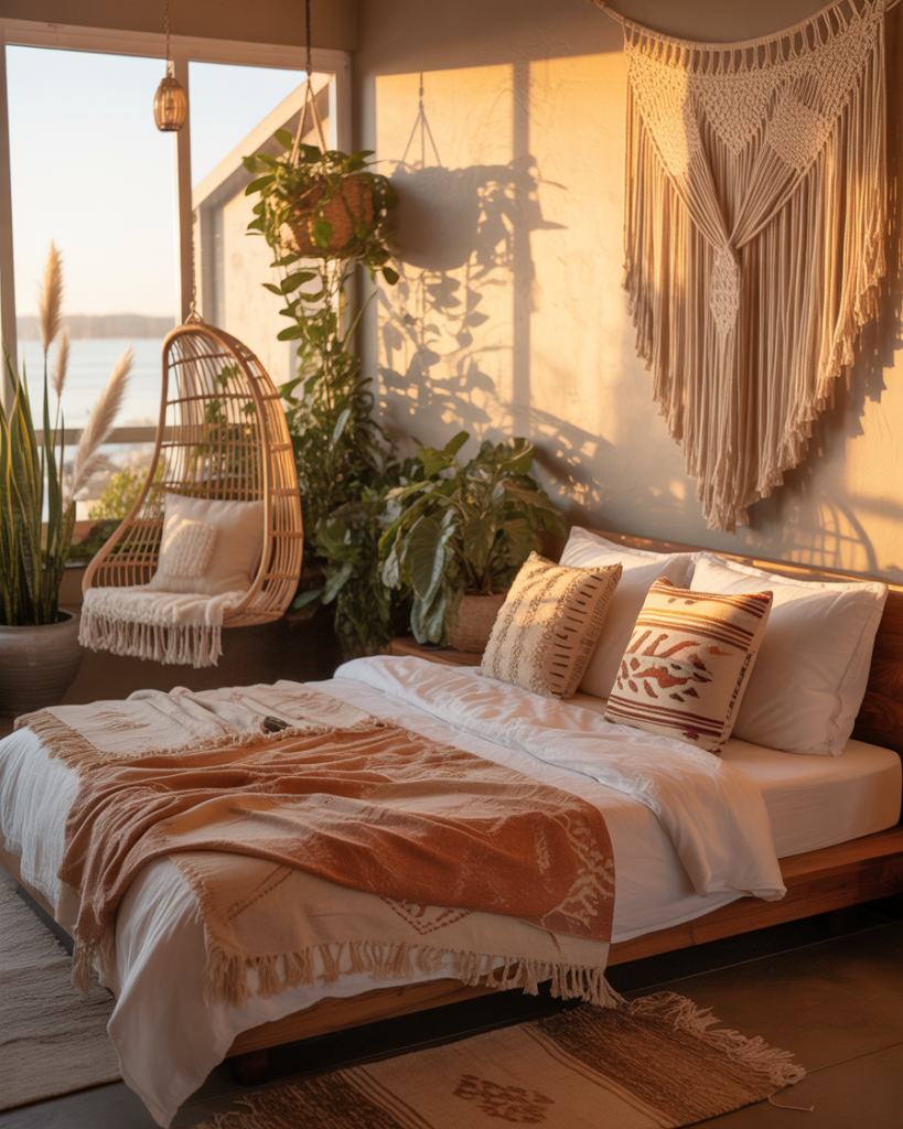 A Cozy Bohemian coastal bedroom layers texture and pattern with abandon, mixing macramé wall hangings, vintage kilim pillows, and soft, sun-faded linens. The palette leans toward warm neutrals—cream, terracotta, rust—with pops of ocean blue or sage green. This style embraces asymmetry and collected charm, with furniture that feels lived-in: a low-slung platform bed, a Moroccan pouf as a nightstand, or a hanging rattan chair in the corner. Plants are essential, from trailing ivy to a cluster of succulents on a floating shelf.