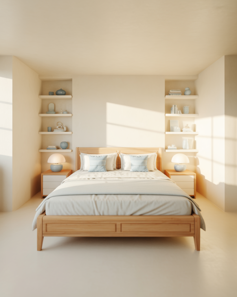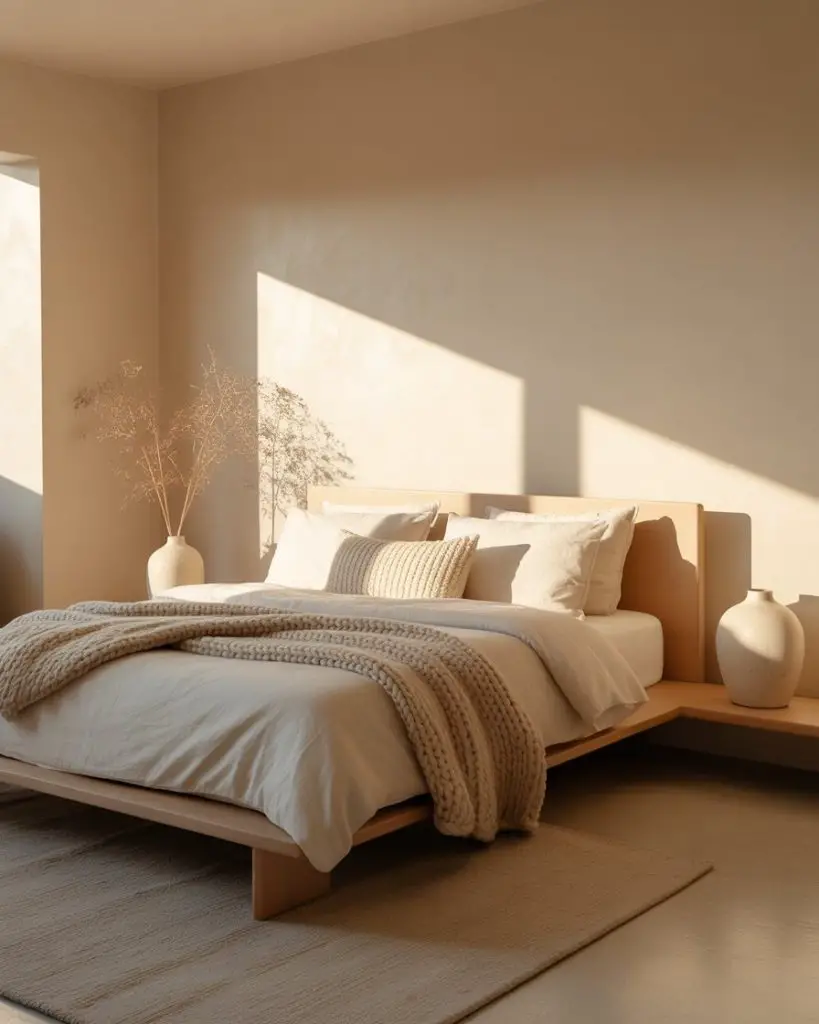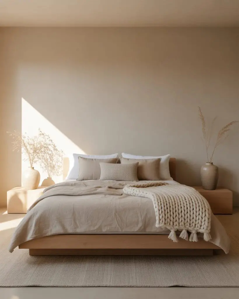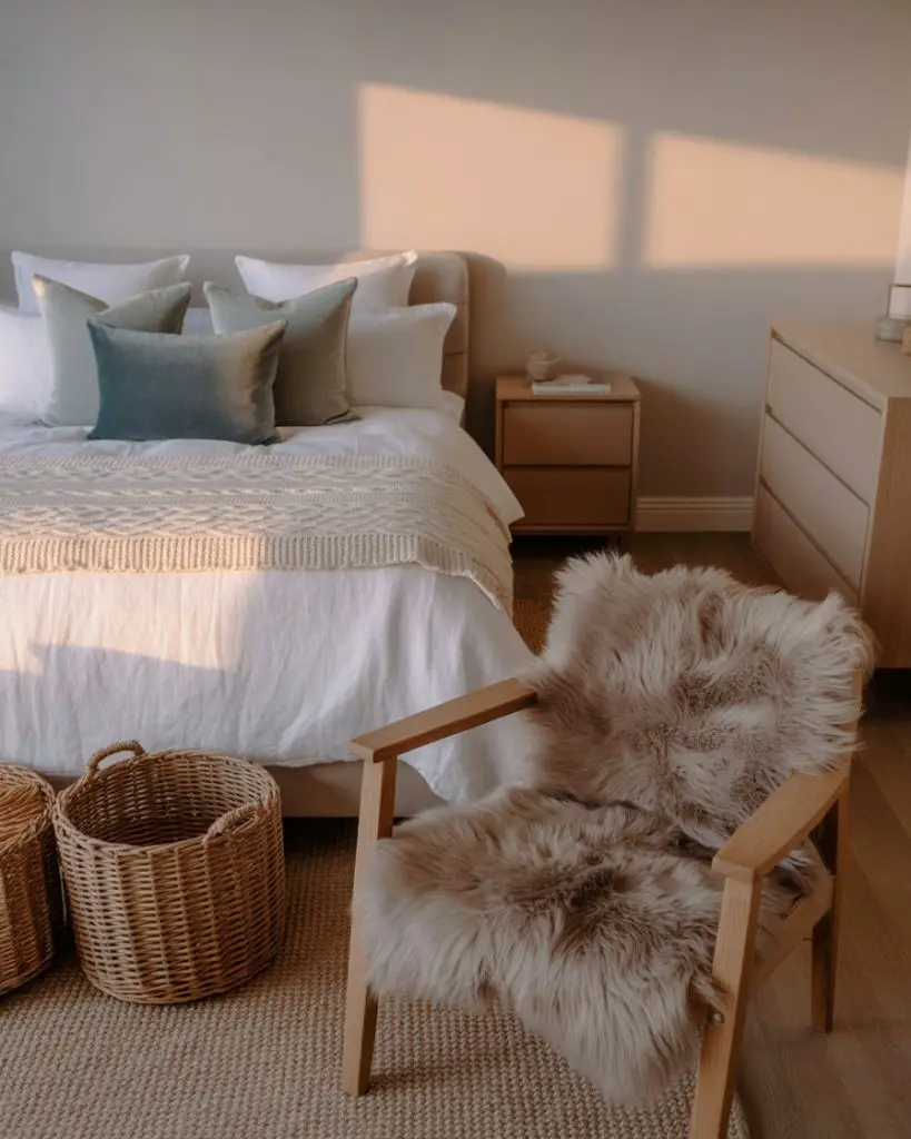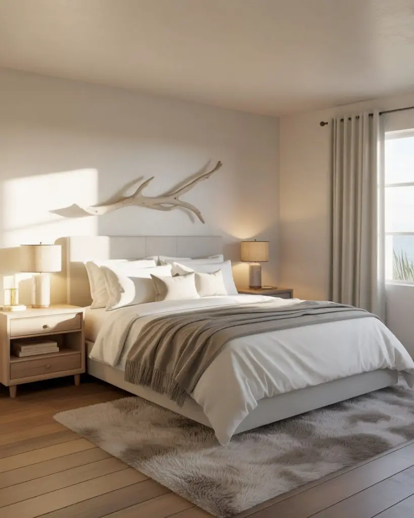 A Cozy Neutral coastal bedroom prioritizes comfort and warmth, layering soft textiles in shades of cream, beige, taupe, and soft gray. Think a linen duvet, a chunky cable-knit throw, velvet pillows, and a sheepskin rug draped over a reading chair. The absence of bold color creates a soothing, womb-like atmosphere perfect for deep rest. Natural wood furniture in light or medium tones adds warmth, while woven baskets and ceramic accents introduce subtle texture. The goal is a space that invites you to slow down, curl up, and exhale.