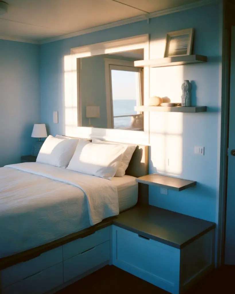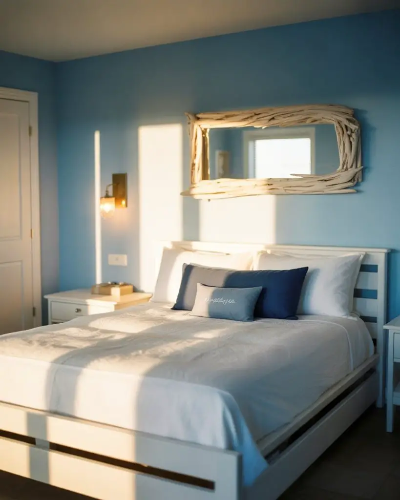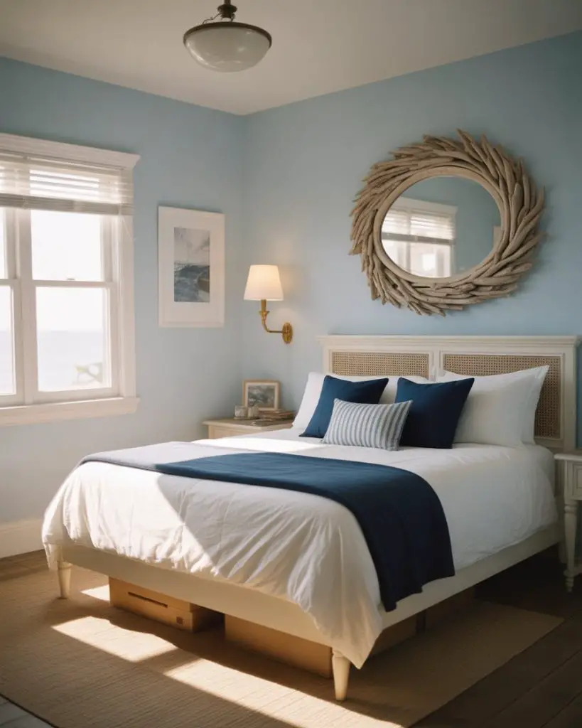 Decorating a Small coastal bedroom requires smart choices that maximize light and minimize clutter, and Blue is your ally here. Opt for a pale sky blue on the walls to visually expand the space, pair it with white trim and furniture, and add depth with navy or cobalt accents in throw pillows, a bedside lamp, or a vintage quilt. Mirrors—especially those with driftwood or rope frames—reflect light and make the room feel larger. Wall-mounted lighting frees up precious nightstand space, and under-bed storage keeps belongings out of sight.