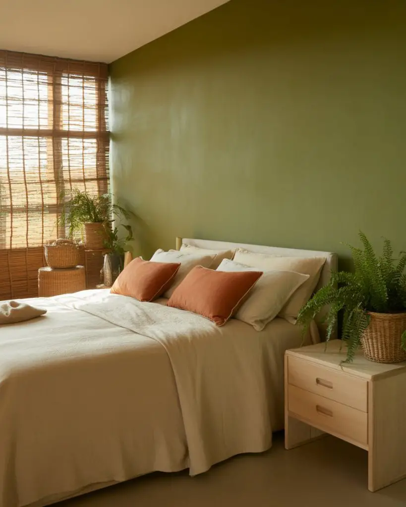 Green tones—from sage to olive to eucalyptus—bring an Earthy dimension to coastal design, grounding the breezy aesthetic with natural, botanical energy. Pair these greens with warm neutrals like terracotta, sand, and cream, and incorporate live plants—ferns, snake plants, or a fiddle leaf fig—to enhance the organic vibe. Natural materials like bamboo blinds, seagrass baskets, and unfinished wood furniture reinforce the connection to nature. The result is a bedroom that feels fresh, calming, and effortlessly put-together.