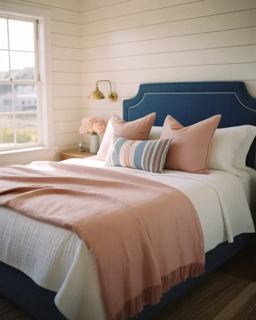 Embrace a Preppy coastal aesthetic by pairing soft Pink and blue tones in a way that feels fresh rather than juvenile. Think blush linen throws over a navy upholstered headboard, striped pillows in pale pink and chambray, and white shiplap walls that ground the palette. This combination nods to classic New England beach houses but updates the look with modern proportions and edited styling. A vintage brass sconce or a framed nautical chart in muted tones adds personality without tipping into kitsch.