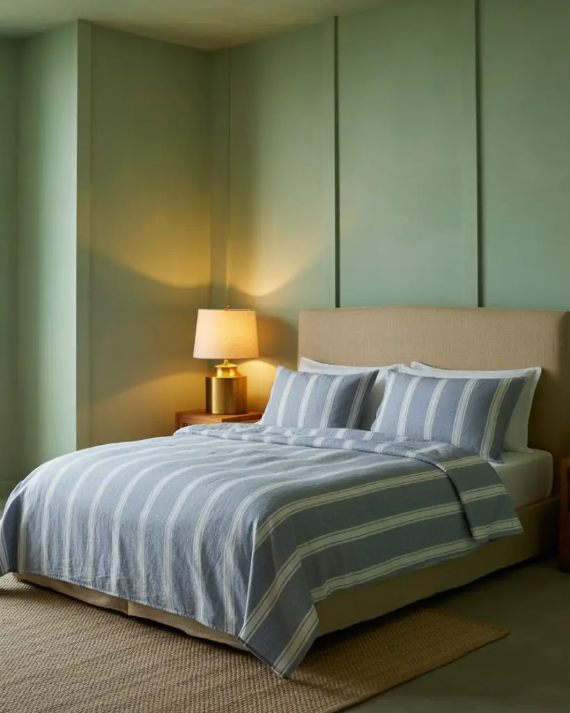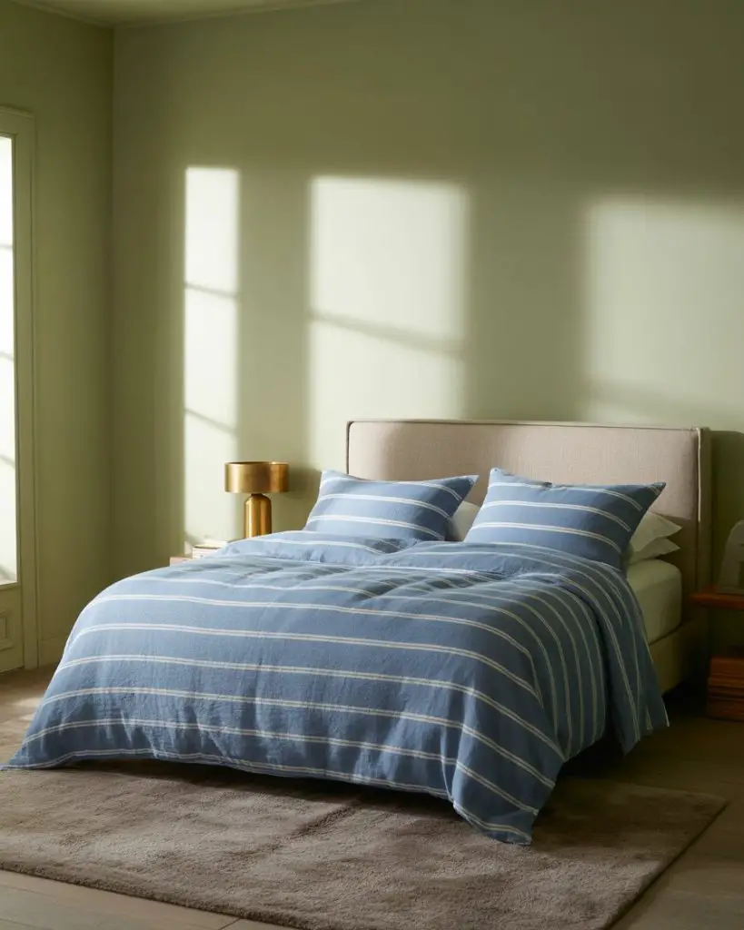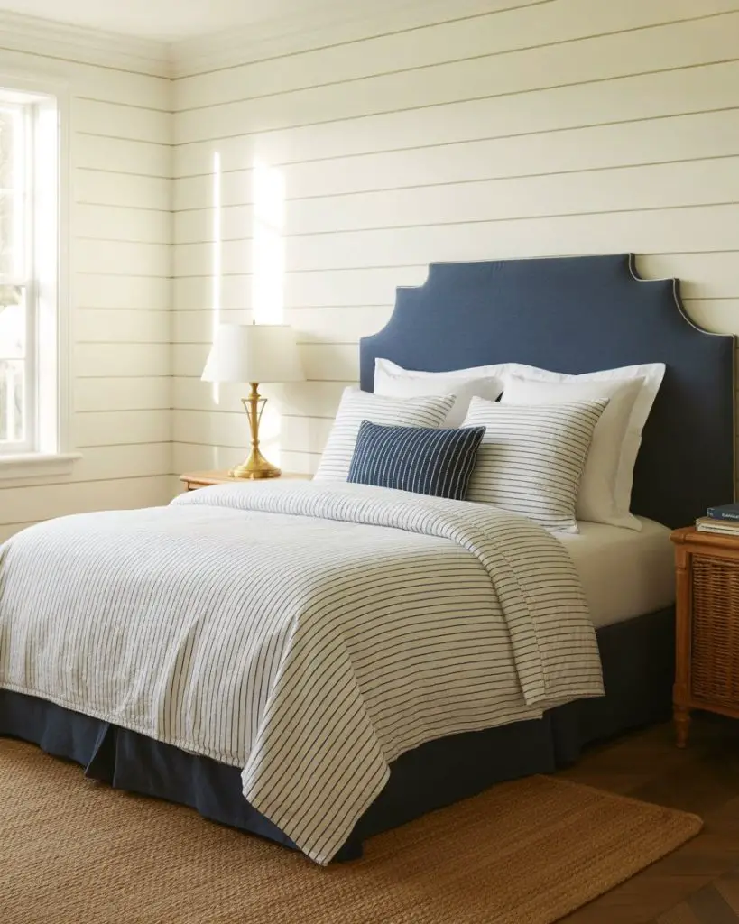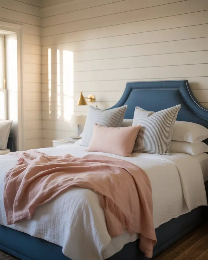 One common mistake here is overloading the space with too many patterns—stick to one or two stripes or florals, and let solid linens balance the energy. In the Northeast, this palette feels right at home in coastal cottages from Cape Cod to the Hamptons, where homeowners appreciate a look that’s polished but never stuffy. Budget-conscious decorators can achieve this with affordable bedding from retailers like Target or West Elm, investing instead in one quality piece like the headboard.