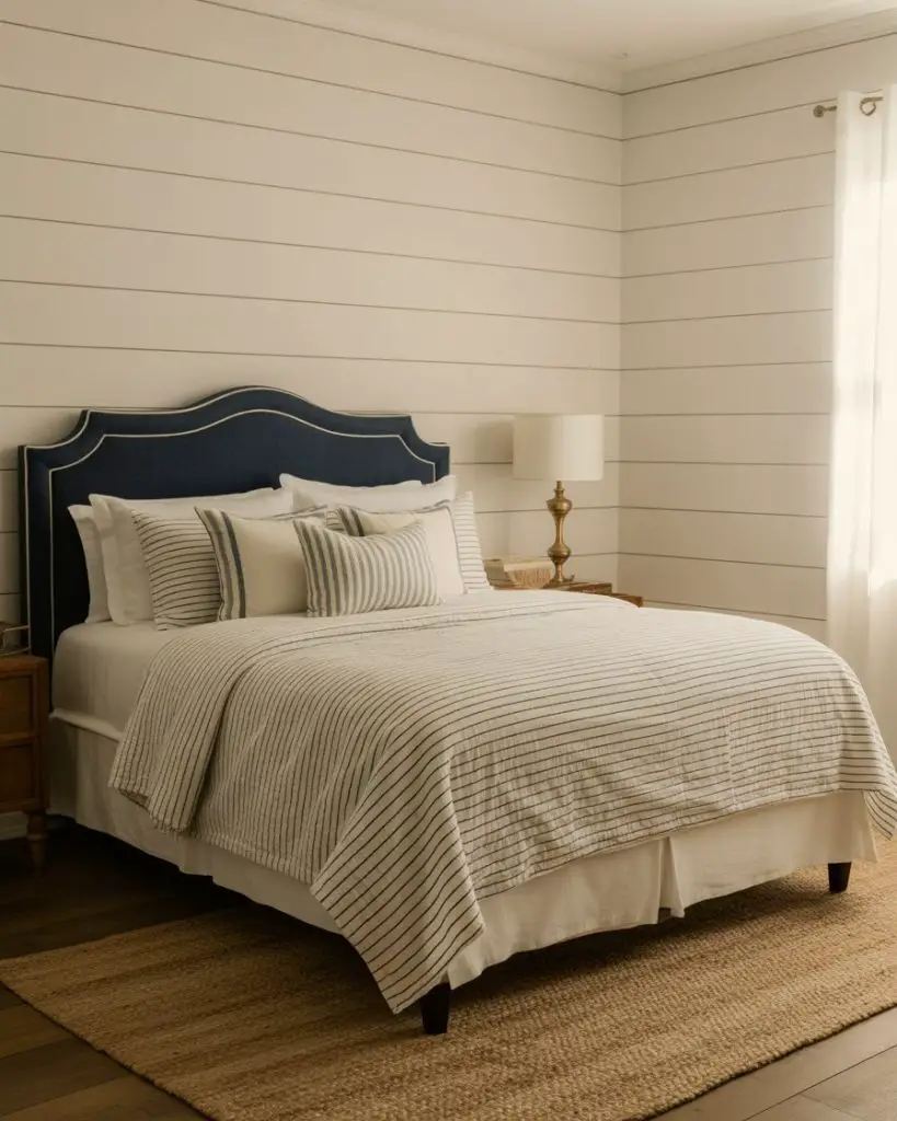 A Moody take on coastal design flips expectations, embracing deep navy, charcoal, or slate Blue walls that evoke stormy seas and twilight skies. This approach pairs dramatic color with natural materials—a whitewashed wood bed frame, linen bedding in cream or soft gray, and brass or matte black fixtures. The result is intimate and cocooning, ideal for bedrooms where you want to create a restful retreat. Layered lighting—a bedside sconce, a table lamp, or even string lights—ensures the space doesn’t feel too dark or cave-like.