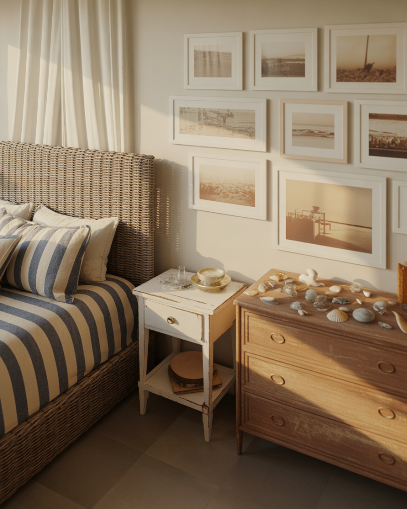 A Vintage coastal bedroom draws on thrifted treasures and Eclectic pairings—think a weathered teak dresser, a rattan headboard from the 1970s, and mismatched nightstands in soft seafoam and cream. This style celebrates imperfection and history, layering patterns like faded ticking stripes, linen florals, and hand-blocked prints. The room feels curated over time rather than purchased all at once, with each piece telling a small story. A gallery wall of vintage postcards or sepia-toned beach photographs adds personality without overwhelming the space.