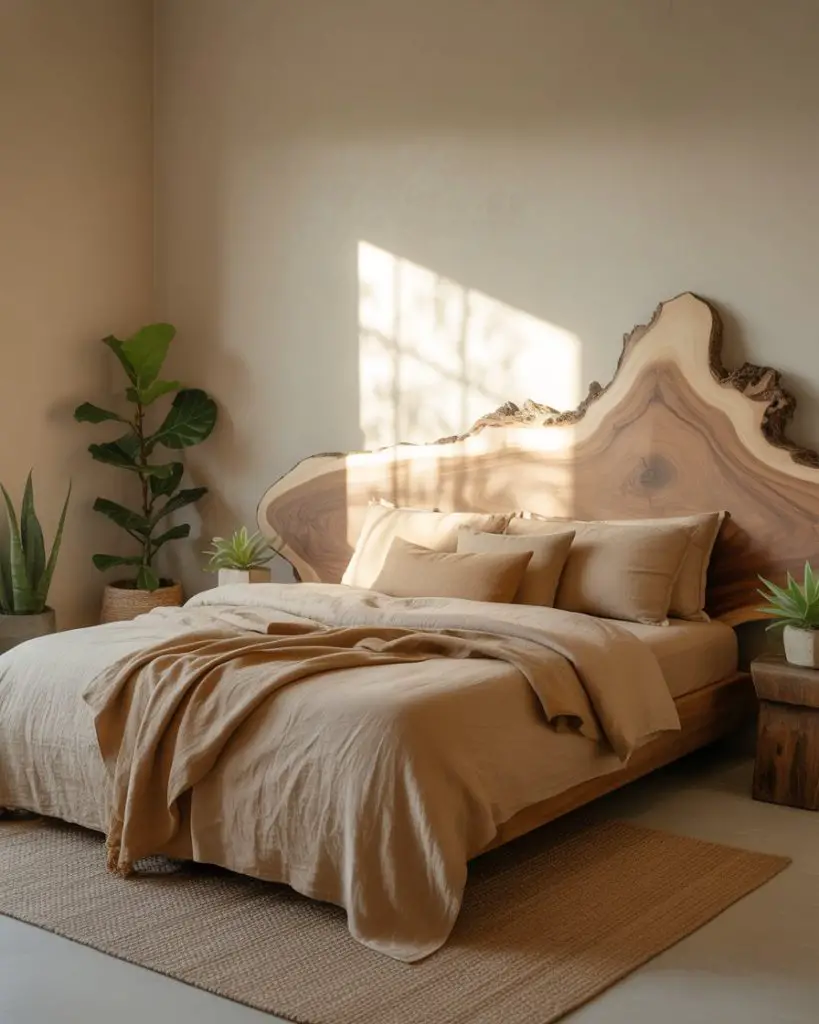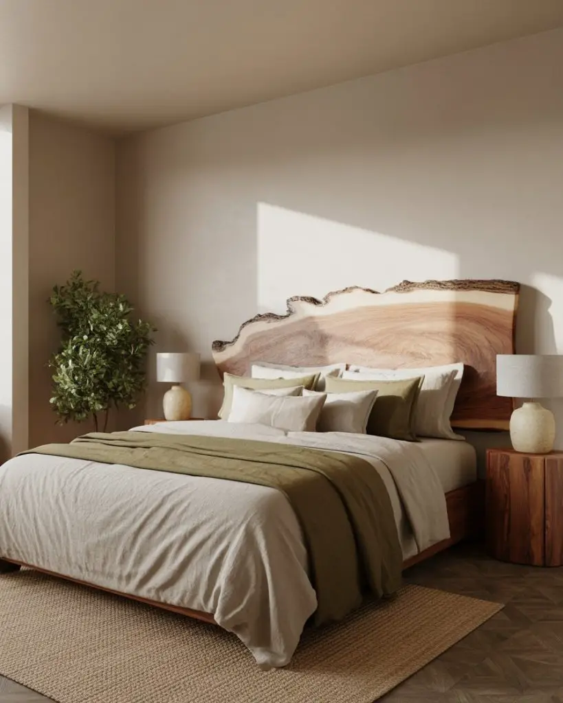 An Earthy approach to coastal design introduces Rustic elements like reclaimed wood, stone accents, and natural fiber textiles. Picture a bedroom with a live-edge wood headboard, walls painted in warm greige, and a jute area rug layered over wide-plank floors. This style feels grounded and organic, drawing inspiration from coastal cliffs and driftwood rather than bright beach umbrellas. Layered linens in sand, olive, and soft gray create a cozy cocoon, while potted greenery—a fiddle leaf fig or trailing pothos—adds life without fuss.