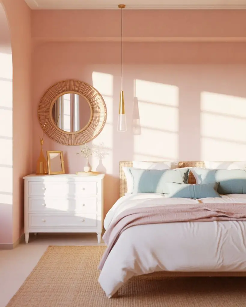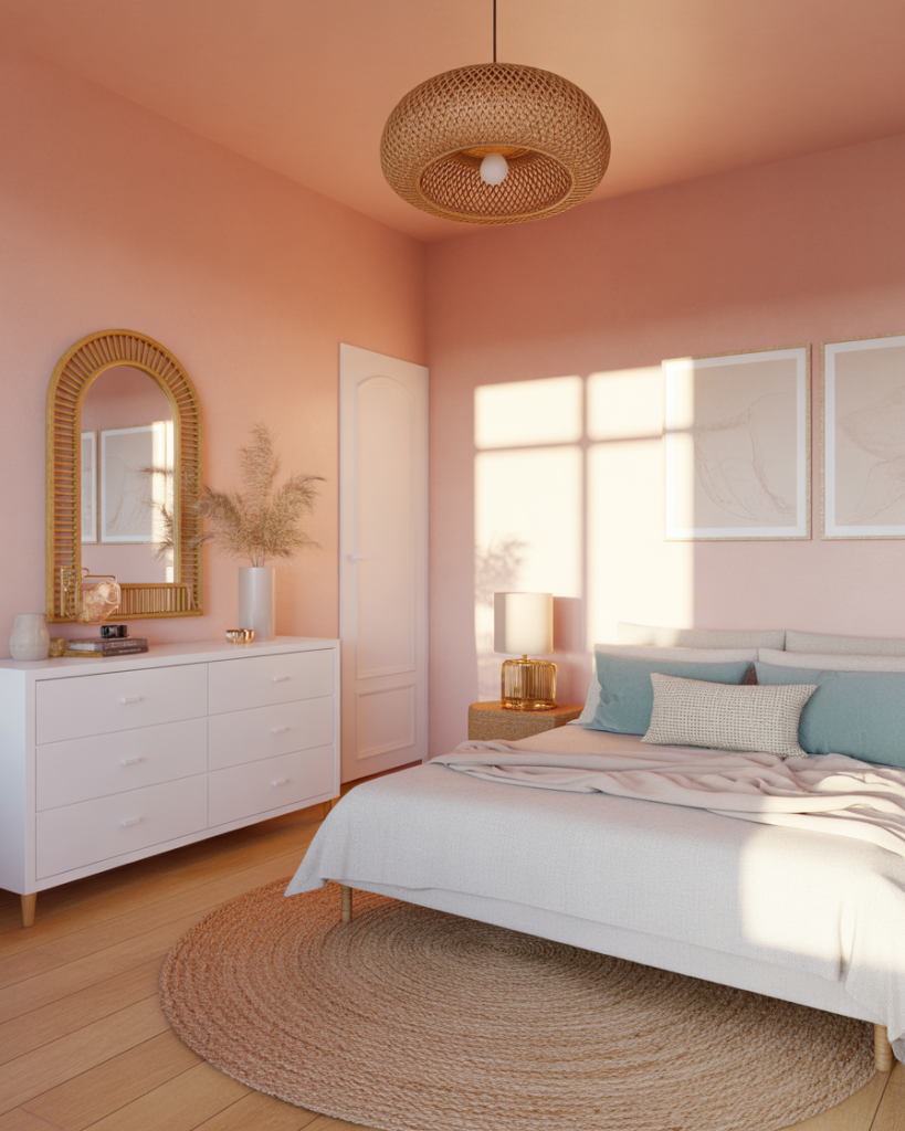 A Cute Pink coastal bedroom strikes a balance between youthful charm and grown-up sophistication, perfect for young professionals or college students. Think blush pink walls paired with white furniture, gold accents, and touches of aqua or seafoam in artwork and textiles. The style avoids saccharine sweetness by incorporating natural materials—a rattan mirror, linen curtains, a jute rug—that ground the palette. String lights or a modern pendant lamp in brass add warmth and personality without feeling too juvenile.