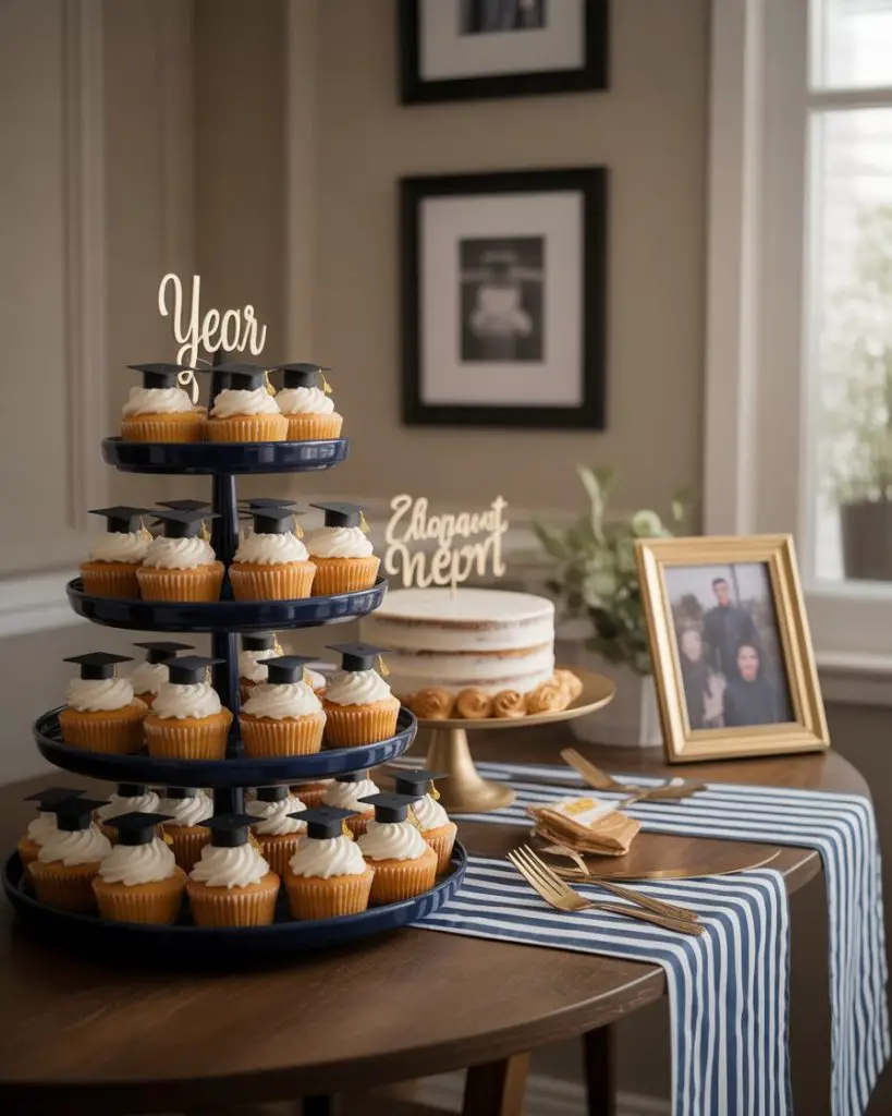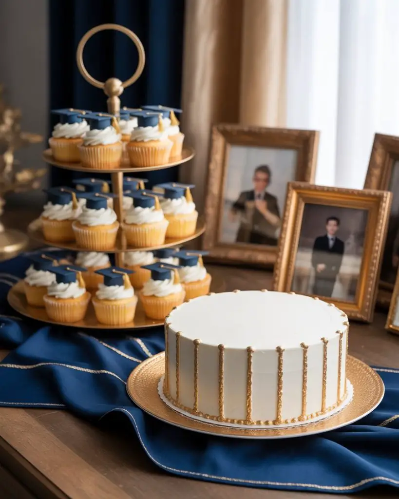 A graduation dessert table should celebrate achievement with sophistication and school pride. Consider a tiered display featuring cupcakes in your graduate’s school colors, a stunning cake topped with a miniature cap and diploma, and gold-dusted macarons that catch the light beautifully. The backdrop can incorporate framed photos from freshman year to senior year, creating an emotional focal point that tells their academic journey. This approach works beautifully for both high school and college graduation party celebrations, giving guests a visual story to admire while they indulge.