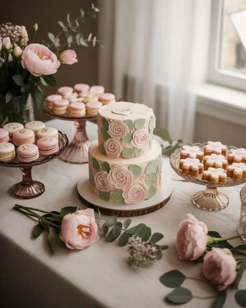 A Baby in Bloom dessert table celebrates new life with botanical beauty, featuring floral-inspired treats surrounded by lush greenery and delicate flower arrangements. Think rose-shaped cupcakes in varying shades of pink, petit fours decorated with edible flowers, lemon lavender cookies, and a centerpiece cake adorned with cascading sugar flowers that look almost real. This theme works beautifully for spring and summer baby showers, creating an Instagram-worthy moment that guests will photograph from every angle while celebrating the mother-to-be.