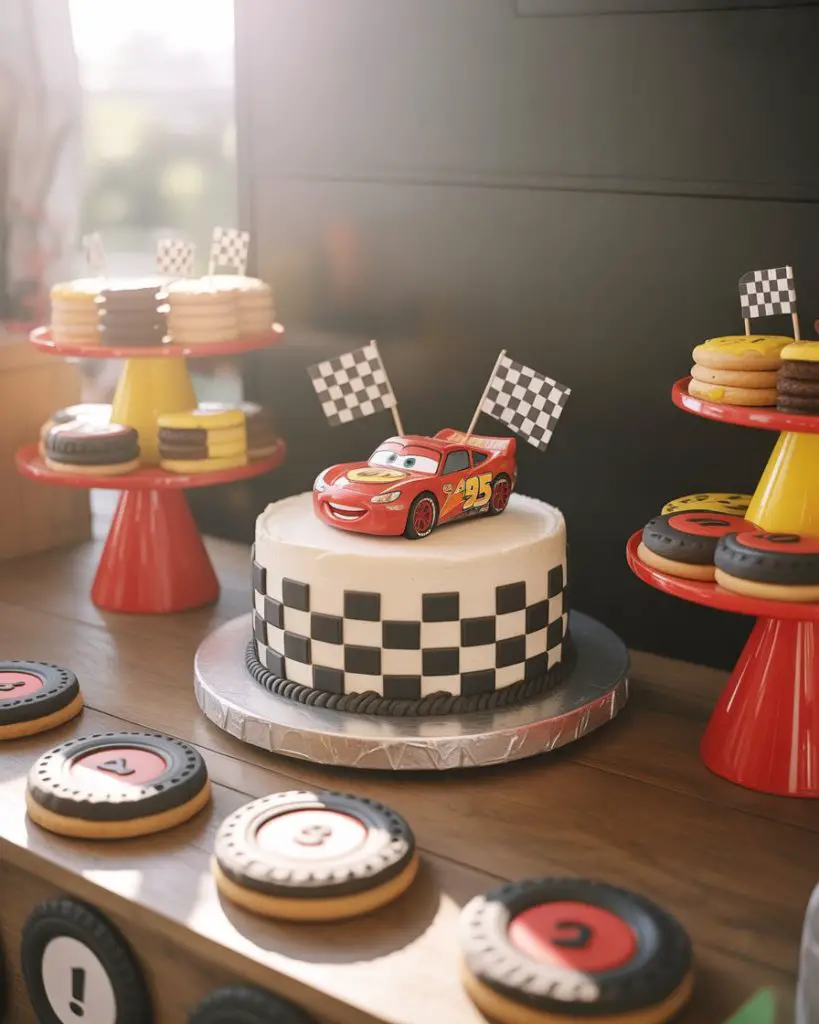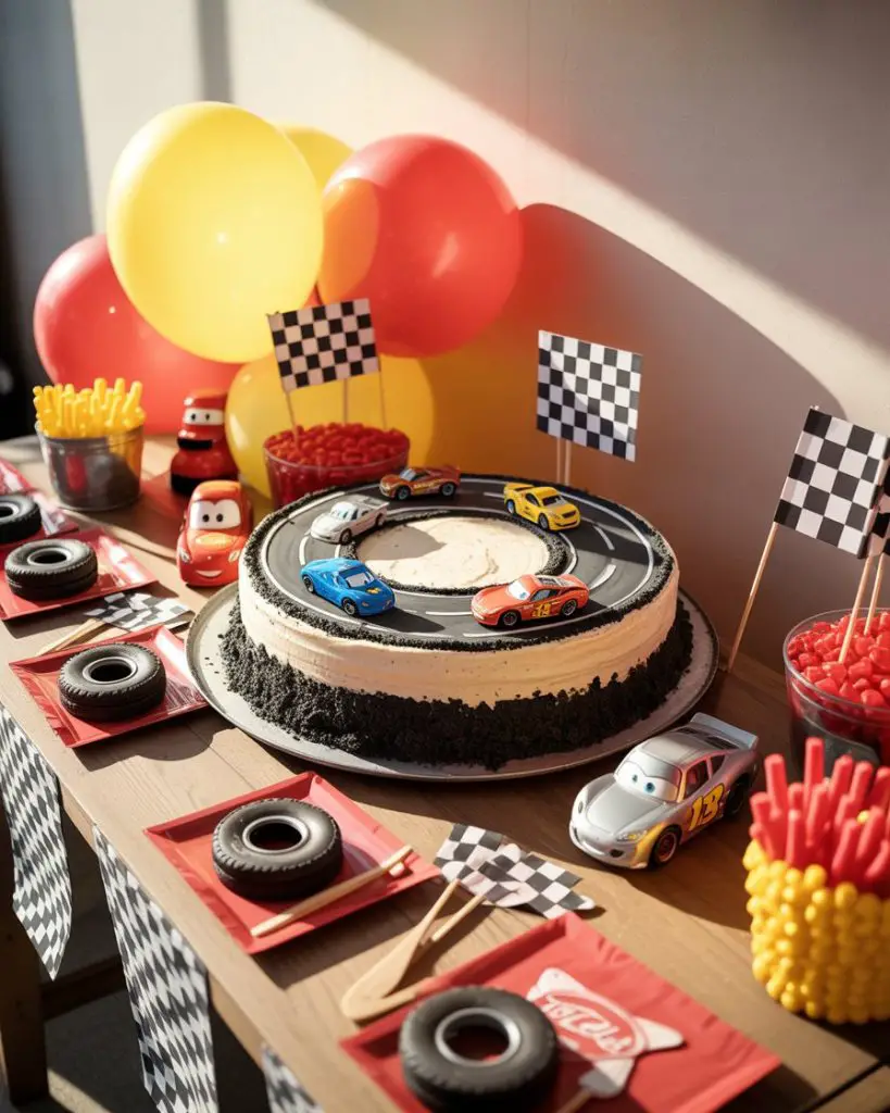 A Cars themed dessert table races into young hearts with vibrant reds, yellows, and checkered flag patterns inspired by Lightning McQueen and friends. Feature a racetrack cake complete with fondant cars, tire-shaped Oreo cookies, traffic light cake pops, and cupcakes topped with edible racing numbers. The energy of this theme comes from bold colors and dynamic arrangements that suggest motion and excitement, perfect for toddler and preschool birthday party celebrations where the birthday child is obsessed with all things automotive.