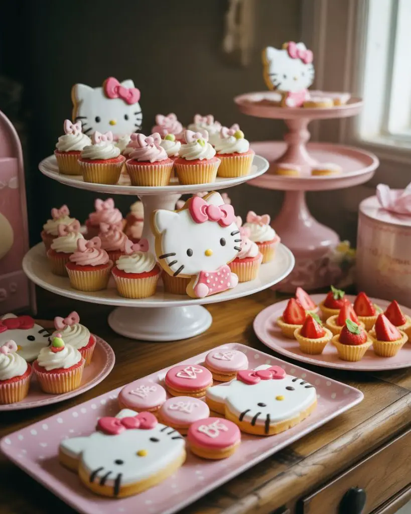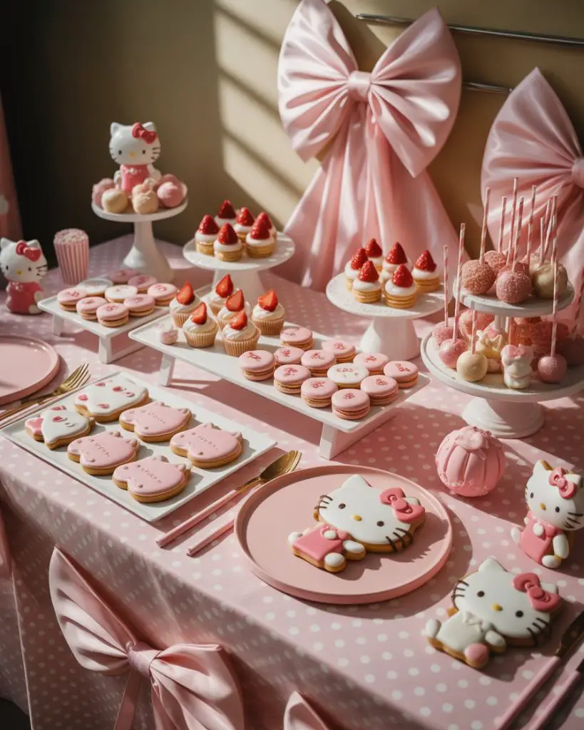 Hello Kitty dessert tables bring kawaii cuteness to celebrations with the iconic character’s signature pink, white, and red color scheme. Feature bow-decorated cupcakes, Hello Kitty face cookies, strawberry-flavored treats (her favorite!), and a cake adorned with her instantly recognizable silhouette or face. The aesthetic should feel playful yet coordinated, with polka dots, bows, and cat motifs repeated throughout the display in a way that’s fun without becoming visually chaotic—balance is key to maintaining the character’s simple, clean design philosophy.