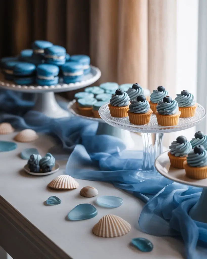 This color choice works particularly well for coastal celebrations or venues near water, where the theme feels environmentally connected rather than arbitrary. One Cape Cod event planner notes that blue dessert tables have become increasingly requested for beach house parties and nautical celebrations because they photograph beautifully against sandy backgrounds and complement seaside venues naturally. To avoid the table feeling too cool or sterile, incorporate warm wood tones in your risers and serving pieces, or add touches of gold or cream to provide visual warmth while maintaining the blue focus.