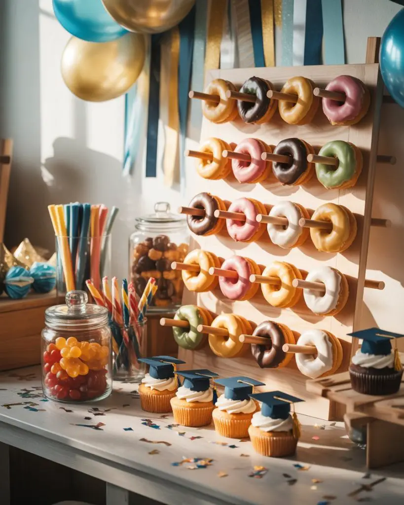 Grad party dessert tables for high school celebrations often lean more casual and fun than formal graduation displays, reflecting the celebratory, friend-focused atmosphere of these gatherings. Think donut walls, candy buffets in school colors, a sheet cake decorated with inside jokes or the graduate’s future college logo, and treats served in creative ways like milkshakes topped with mini cupcakes or cookie sandwiches with ice cream. The vibe should feel festive and slightly indulgent—this is a party, after all, not a formal ceremony reception.