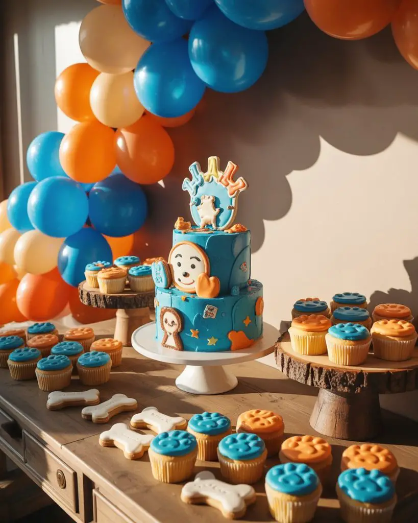 The Bluey phenomenon has captured hearts across America, making it one of the most requested themes for toddler and preschool birthday parties. A Bluey dessert table brings the beloved Australian Blue Heeler family to life through color and creativity—think bright blues, oranges, and warm neutrals that mirror the show’s palette. Feature a custom cake decorated with Bluey, Bingo, and their family, surrounded by bone-shaped cookies, paw print cupcakes, and blue-tinted meringues that look like fluffy clouds from the show’s cheerful outdoor scenes.