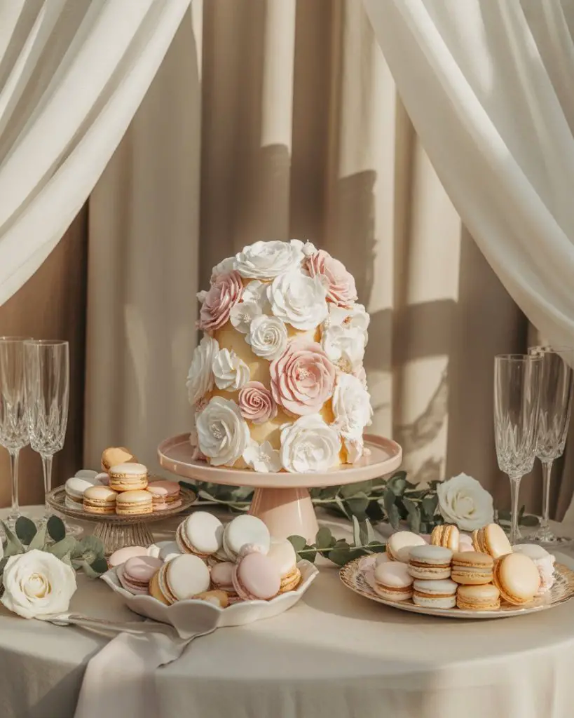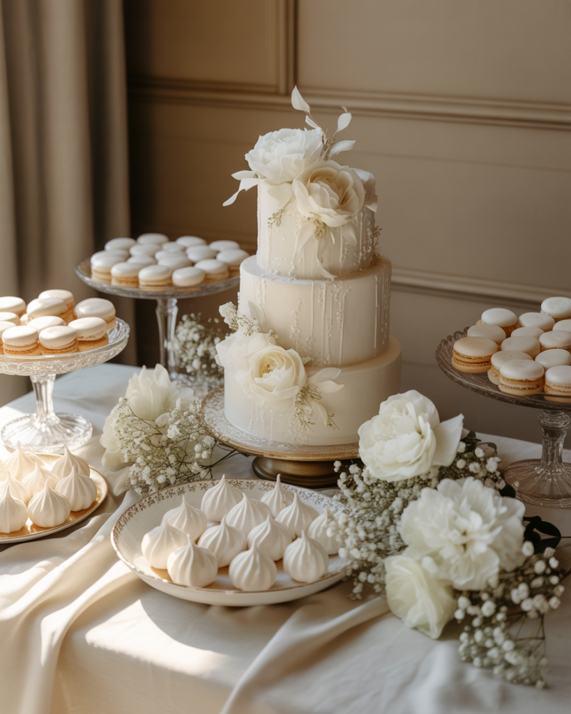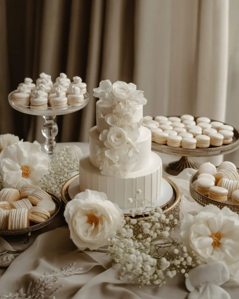White dessert tables for weddings embody timeless elegance and versatility, complementing any wedding style from modern minimalist to classic romantic. An all-white dessert display featuring vanilla and almond-flavored treats—white chocolate mousse cups, coconut macarons, vanilla bean cupcakes, and a stunning white-on-white wedding cake—creates a sophisticated, cohesive look that photographs beautifully and never feels dated. The monochromatic palette allows texture to become the visual interest: buttercream swirls, fondant details, fresh white flowers, and varied heights in the display creating depth without relying on color contrast.
