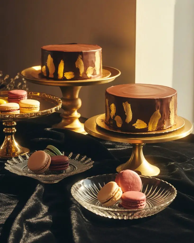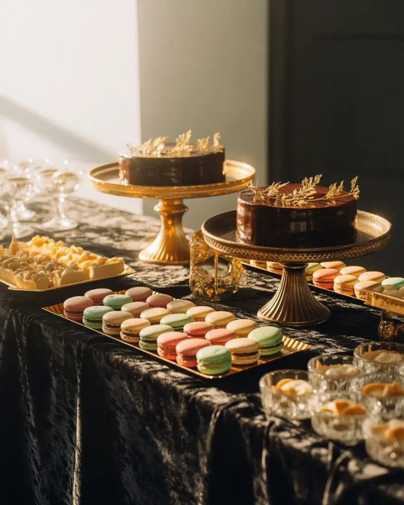 A black and gold dessert table exudes timeless glamour perfect for milestone celebrations, from Sweet 16 parties to anniversary celebrations. The dramatic contrast creates instant sophistication—picture a black velvet tablecloth cascading to the floor, topped with gold cake stands holding chocolate ganache cakes, champagne-flavored macarons, and cookies decorated with edible gold leaf. This color combination photographs beautifully and works equally well for formal evening events or upscale daytime gatherings where elegance is the goal.