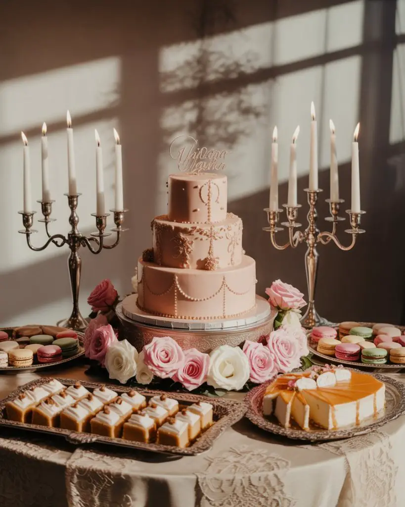 A quinceanera dessert table represents one of the most important cultural celebrations in Latin American communities across the United States, marking a young woman’s transition to adulthood. These tables traditionally feature elaborate multi-tier cakes, tres leches cupcakes, Mexican wedding cookies, and colorful conchas arranged with religious and symbolic elements. The color scheme typically reflects the quinceañera’s chosen palette—often pastels, jewel tones, or metallics—with fresh flowers, candelabras, and sometimes a small photograph of the honoree as a centerpiece that connects tradition with personal style.