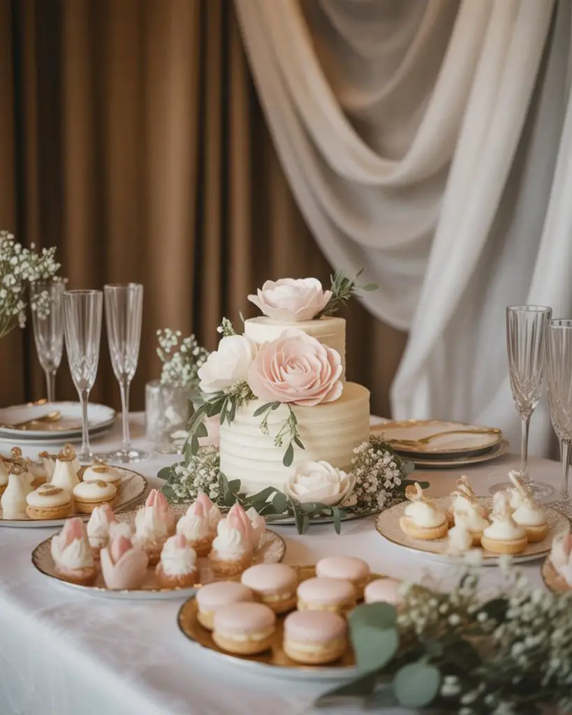 A bridal shower dessert table sets the tone for an intimate celebration of love and friendship, typically featuring elegant, feminine touches that complement the bride’s wedding aesthetic. Consider a white and blush color palette with champagne-flavored cupcakes, delicate lemon tarts, rose-adorned sugar cookies, and a small two-tier cake decorated with fresh flowers or buttercream ruffles. The display should feel sophisticated yet approachable, encouraging guests to indulge while mingling and celebrating the bride-to-be in a relaxed atmosphere.