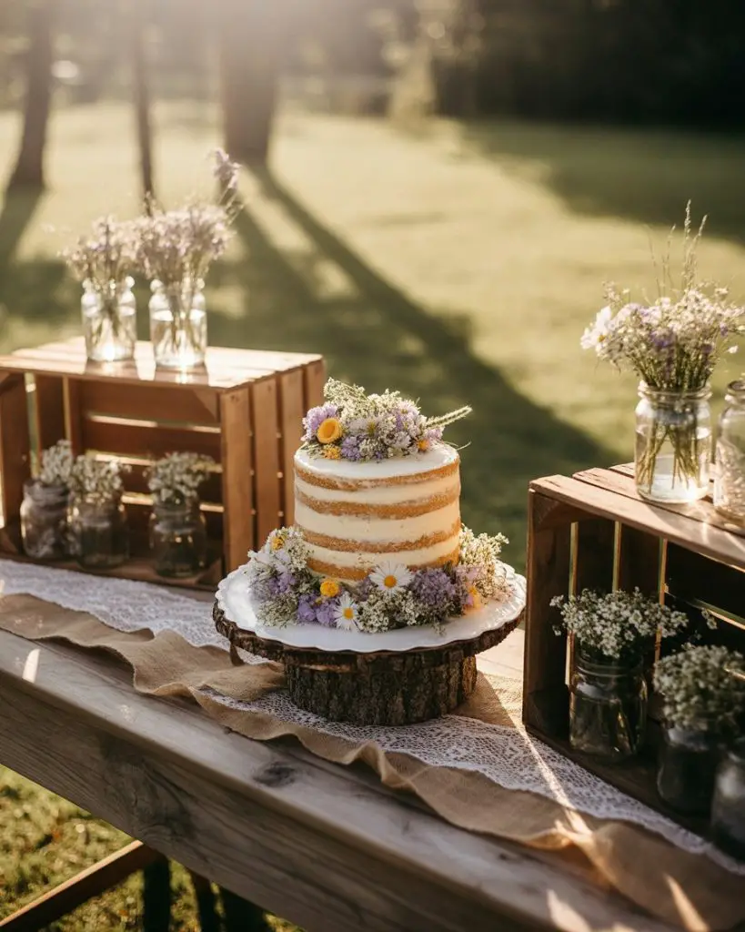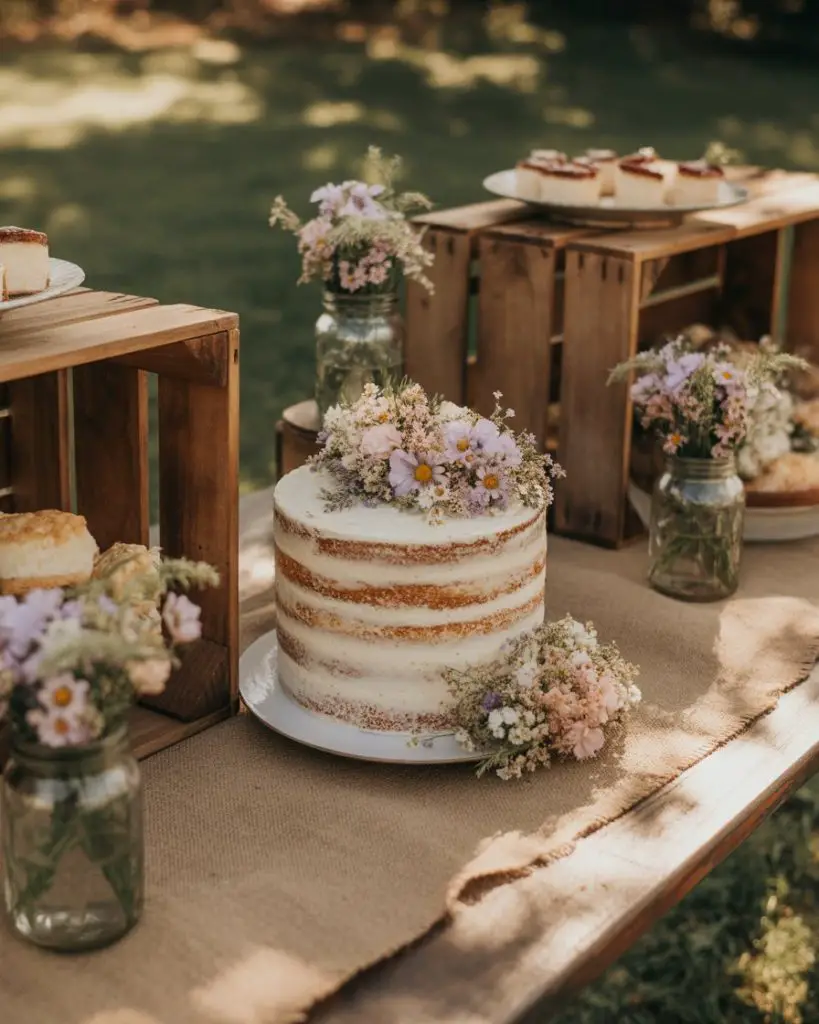 A rustic wedding dessert table embraces natural materials and understated elegance, perfectly suited for barn venues, outdoor celebrations, or couples who prefer organic beauty over formal glamour. Feature a naked or semi-naked cake adorned with fresh berries and wildflowers, displayed on a wooden slice or vintage cake stand. Surround it with mason jars filled with individual servings of pie, burlap-wrapped cupcakes, and homestyle cookies arranged in vintage crates or galvanized buckets that reinforce the countryside aesthetic without feeling contrived.
