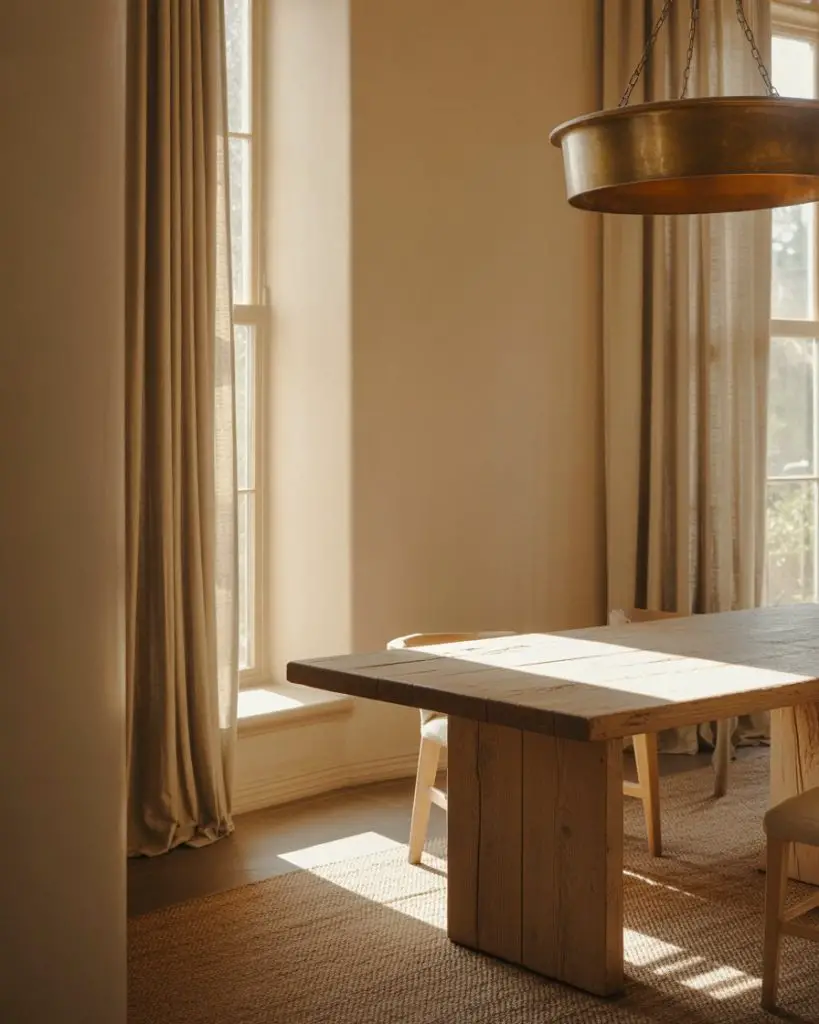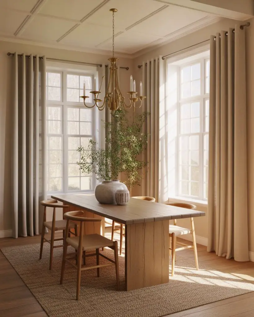 This approach centers on neutral tones—creamy whites, soft taupes, and warm beiges—layered with vintage brass fixtures and weathered wood accents. It’s a simple formula that works beautifully in open-concept homes where the dining area flows into the kitchen or living room. The key is mixing textures: linen curtains, a chunky wool rug, and a reclaimed wood table that anchors the space without overwhelming it.