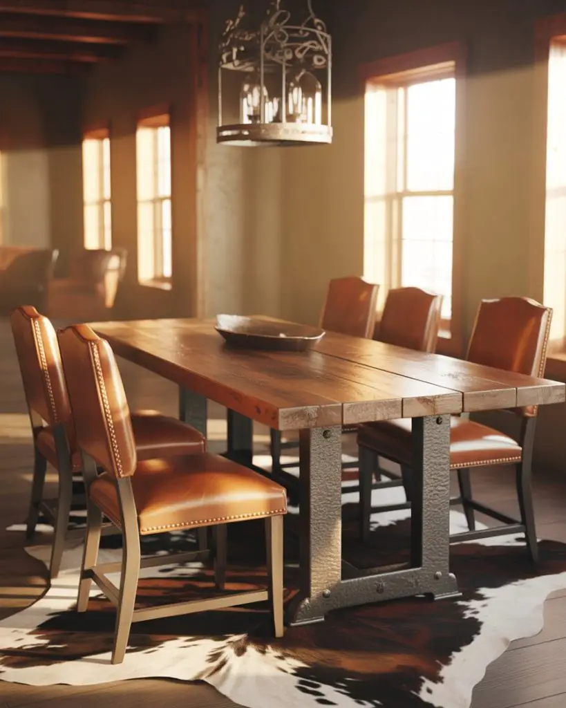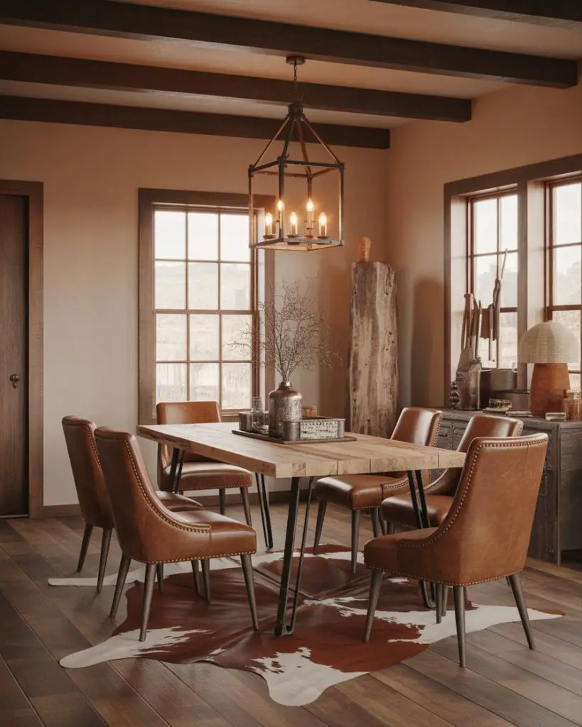 A Western-inspired dining room brings in rugged materials like leather, iron, and reclaimed wood. Picture a chunky wood table with wrought iron legs, leather dining chairs with nailhead trim, and a cowhide rug underneath. The palette is earthy—browns, tans, deep reds—and the overall vibe is warm and masculine without feeling overly themed. Vintage lantern-style lighting and wall art featuring landscapes or abstract desert tones complete the look.