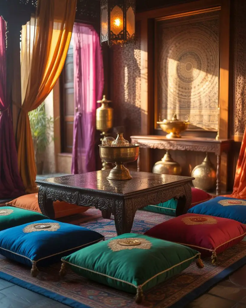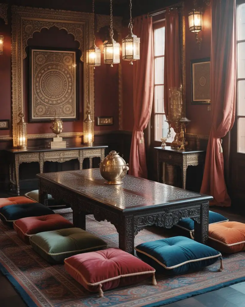 An Indian-inspired dining room celebrates bold color, intricate patterns, and handcrafted details. Think jewel tones—ruby, sapphire, emerald—paired with carved wooden furniture, brass accents, and vibrant textiles. A low-slung wooden table with floor cushions offers an alternative to traditional seating, while wall art featuring mandalas, block prints, or vintage sari fabric adds cultural depth and visual interest.