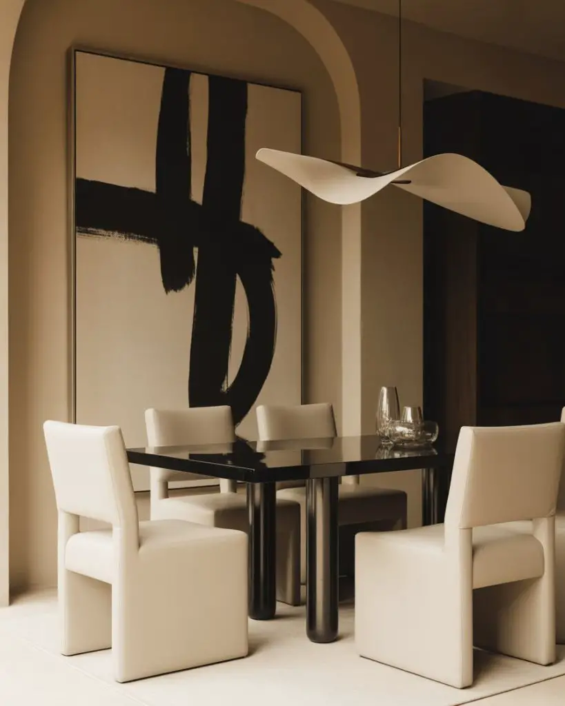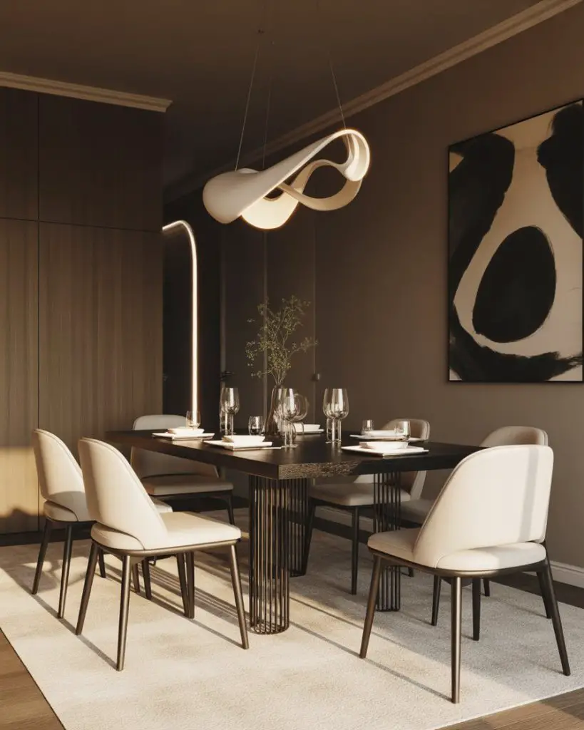 A modern classy dining room relies on a tight monochrome palette—black, white, and gray—with impeccable lines and minimal ornamentation. Picture a sleek black dining table with chrome or brushed steel legs, white leather chairs, and a sculptural pendant light overhead. The wall art is abstract and large-scale, and every accessory is chosen for form as much as function. It’s a look that feels curated and confident.