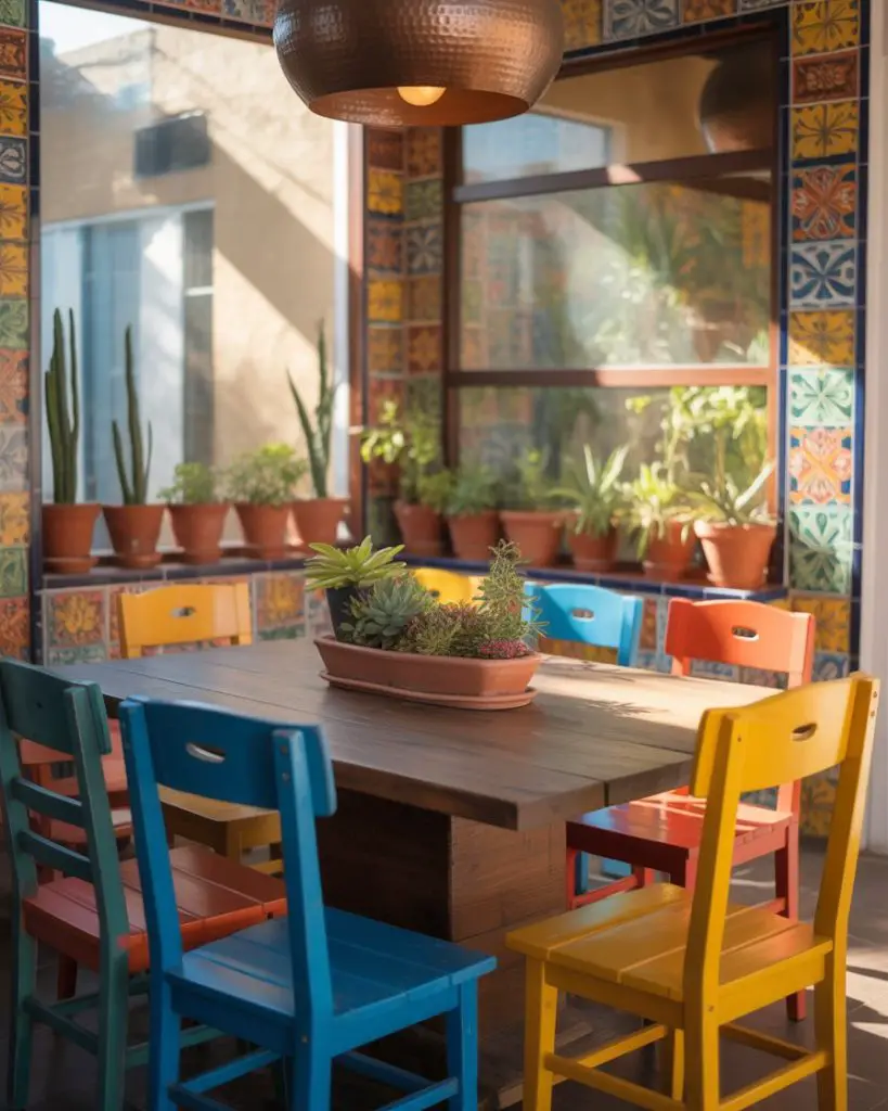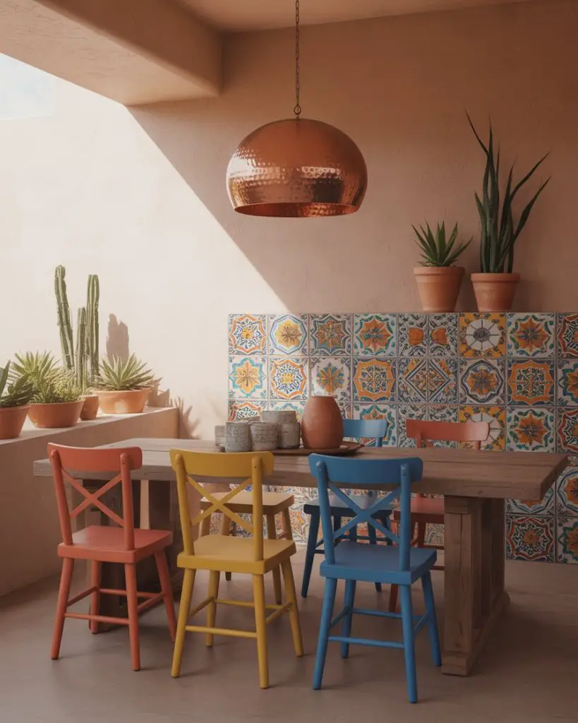 A Mexican-inspired dining room bursts with color and artisan craftsmanship. Incorporate hand-painted Talavera tiles as a backsplash or table runner backdrop, pair with a rustic wooden table, and add woven equipal chairs or painted wooden chairs in bright hues. Terra cotta pots with succulents, hammered copper light fixtures, and textured woven placemats bring warmth and authenticity to the space.