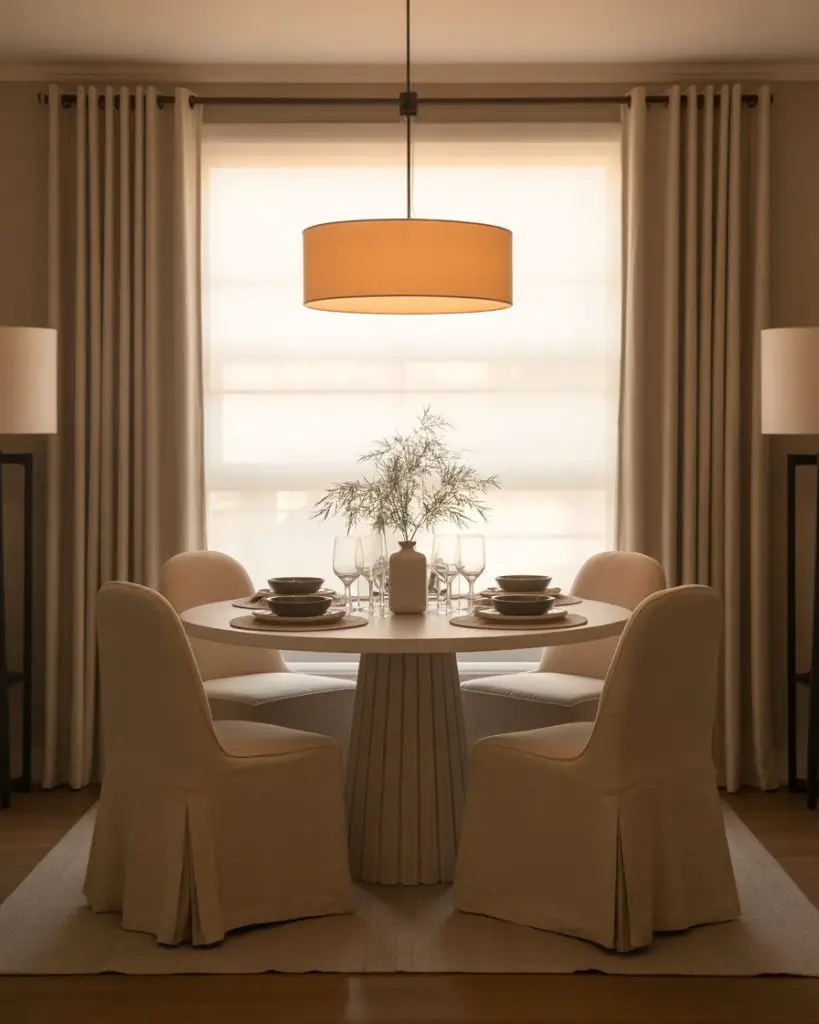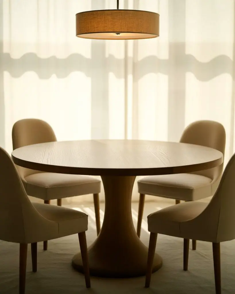 A round table fosters conversation and works wonders in smaller or square-shaped dining rooms. Choose a pedestal base to maximize legroom and avoid the awkward corner-seat experience of rectangular tables. Surround it with upholstered chairs in a neutral or modern fabric, and hang a centered chandelier or pendant light to anchor the space. The circular shape softens the room and makes every seat feel equally important.