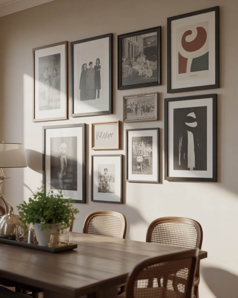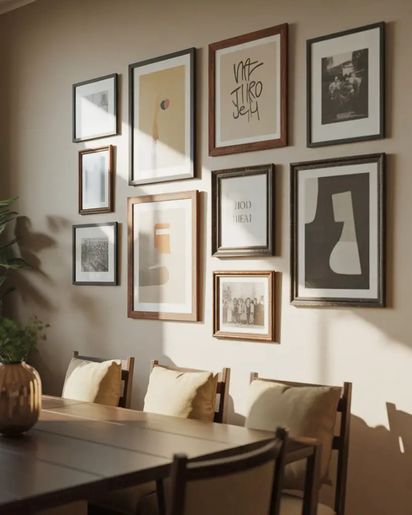 Gallery walls work in almost any home style, from modern to farmhouse to boho. The key is planning the layout on the floor first, then transferring it to the wall to avoid unnecessary holes. A micro tip from a designer friend: use painter’s tape to map out frames on the wall before hammering a single nail. It saves time and ensures a cohesive look without the guesswork.