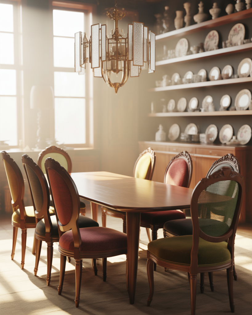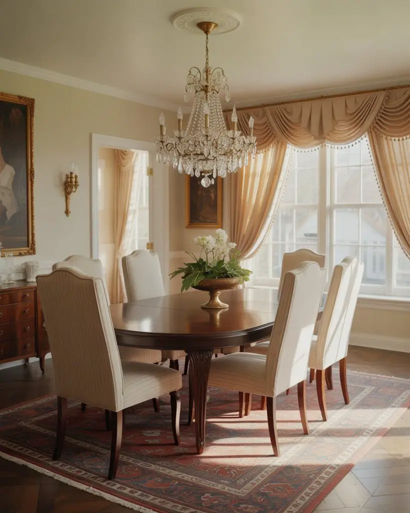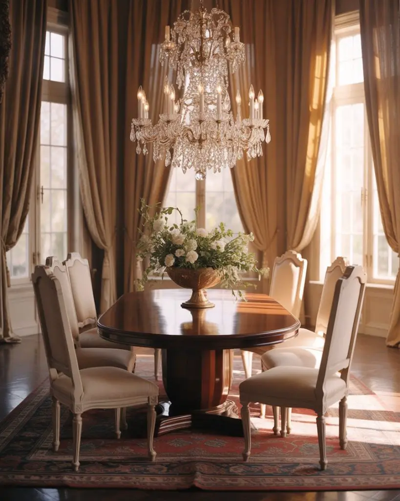 For those who still value a formal dining experience, invest in timeless elegance: a polished wood table, upholstered high-back chairs, a crystal chandelier, and silk drapes pooling on the floor. The palette is refined—deep mahogany, ivory, gold, or burgundy—and every detail is considered. Fine china displayed in a glass-front hutch and a Persian or Oriental rug underfoot complete the sophisticated, classy atmosphere.