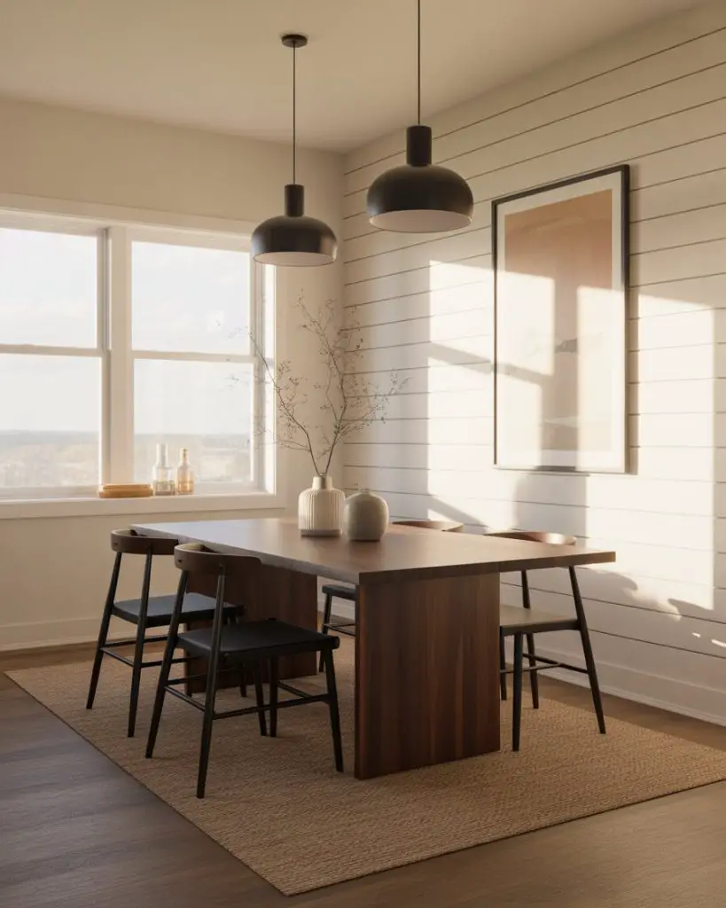The modern farmhouse aesthetic continues to evolve in 2026, with cleaner lines and less clutter than earlier iterations. Think whitewashed shiplap on one accent wall, paired with a sturdy farmhouse table in dark walnut and sleek black metal chairs. The modern twist comes from minimalist pendant lights and a curated selection of wall art—perhaps a large-scale black-and-white photograph or abstract piece.