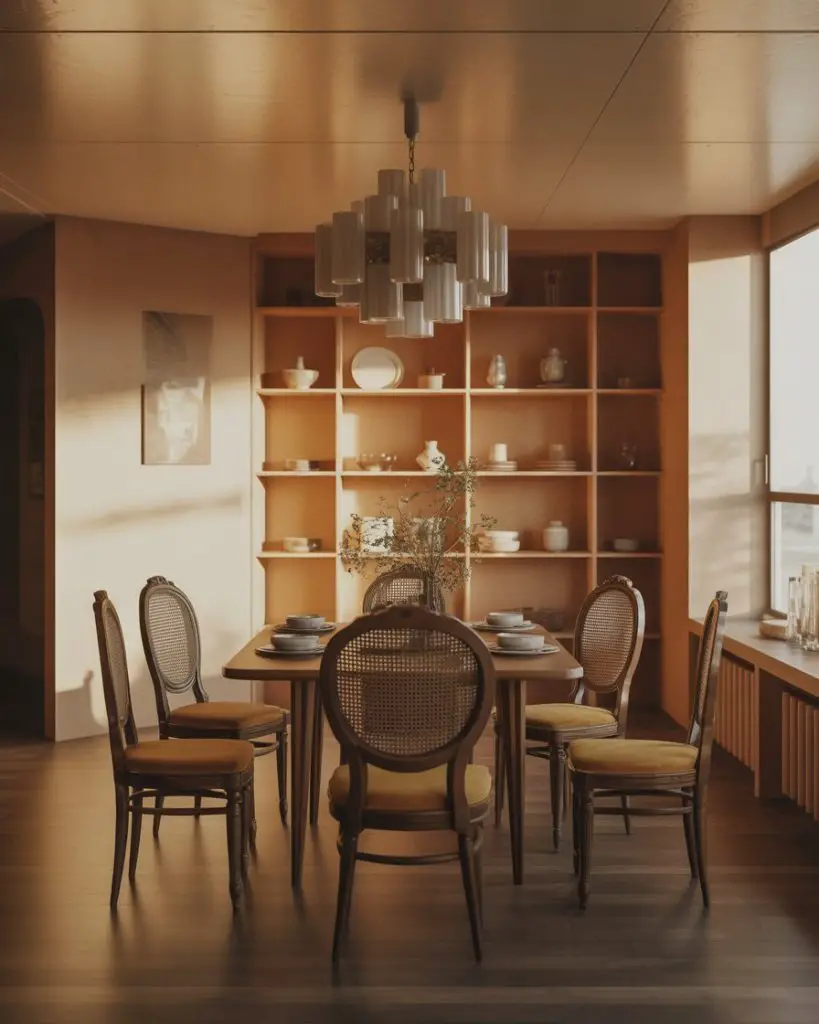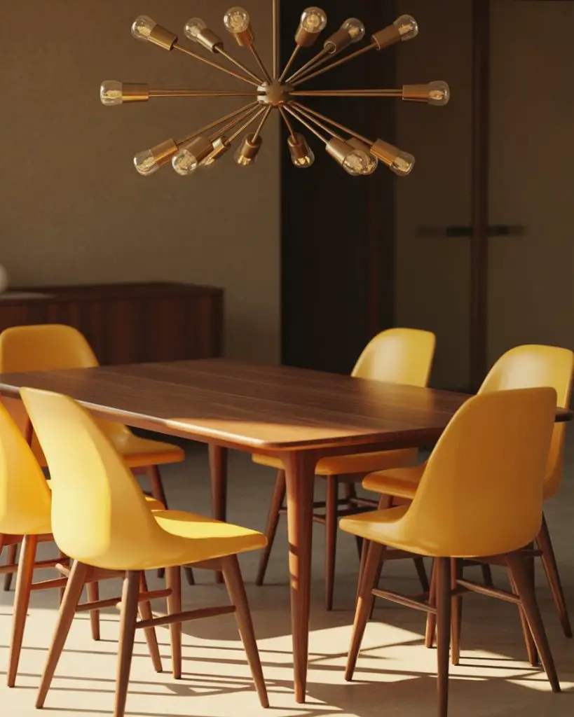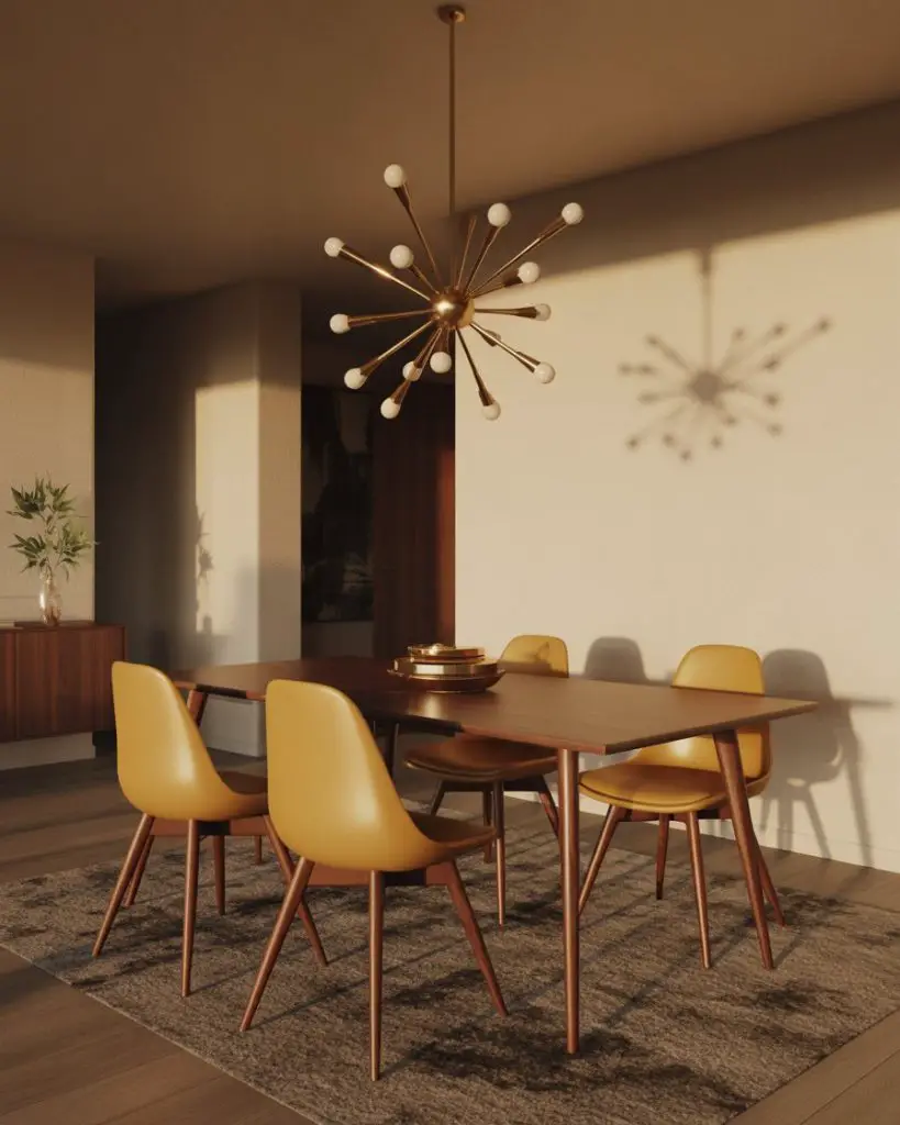 Classic mid century modern design remains a go-to for those who appreciate clean lines and timeless appeal. Picture a sleek walnut dining table with tapered legs, paired with molded plastic or upholstered mid century chairs in mustard or olive. A sculptural brass chandelier or Sputnik-style fixture overhead completes the look, offering both function and a focal point that feels both retro and current.