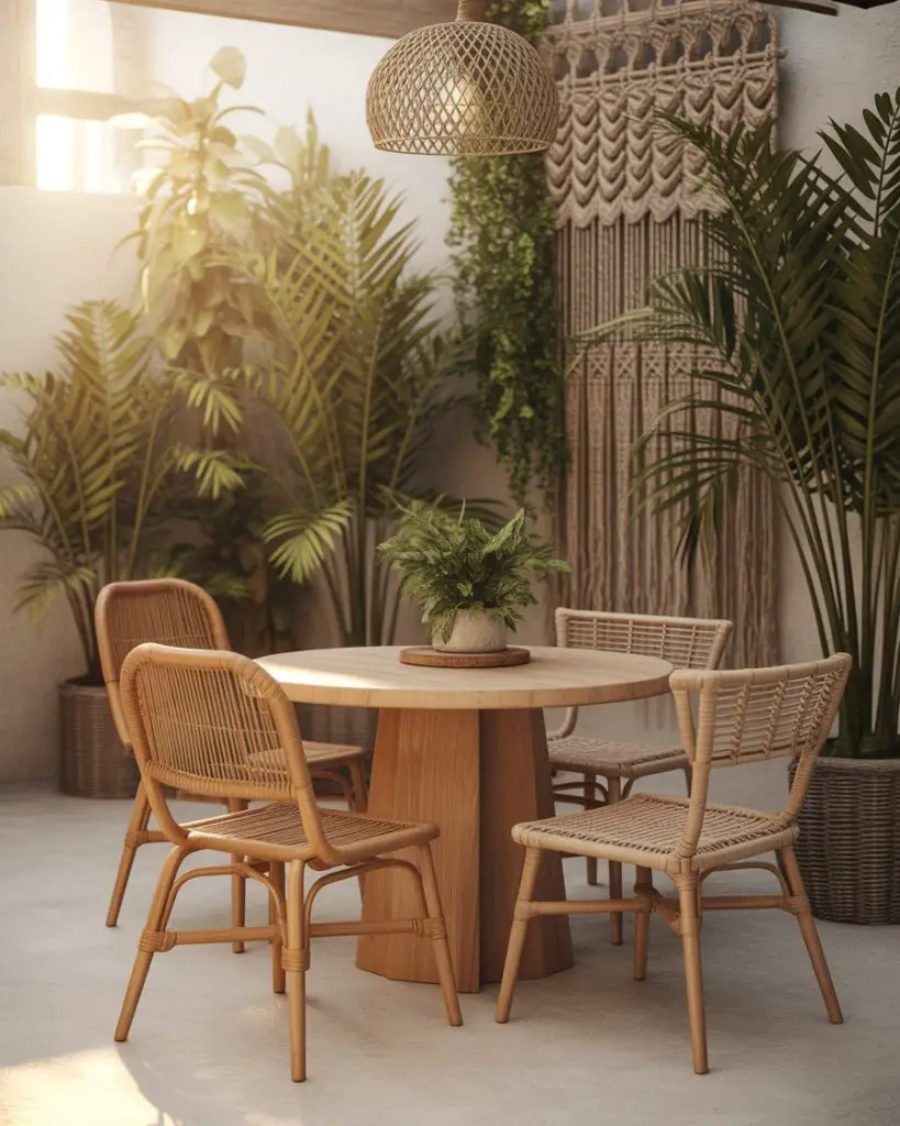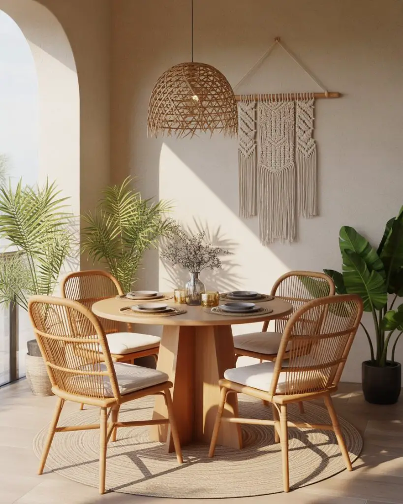 A boho-inspired dining area embraces natural materials and an eclectic, collected-over-time vibe. Start with a round table in light oak or bamboo, surround it with mismatched rattan chairs, and layer in plenty of greenery—potted palms, hanging plants, or a wall-mounted planter shelf. The look is relaxed, inviting, and perfect for small space dining areas or apartment dwellers who want personality without permanence.