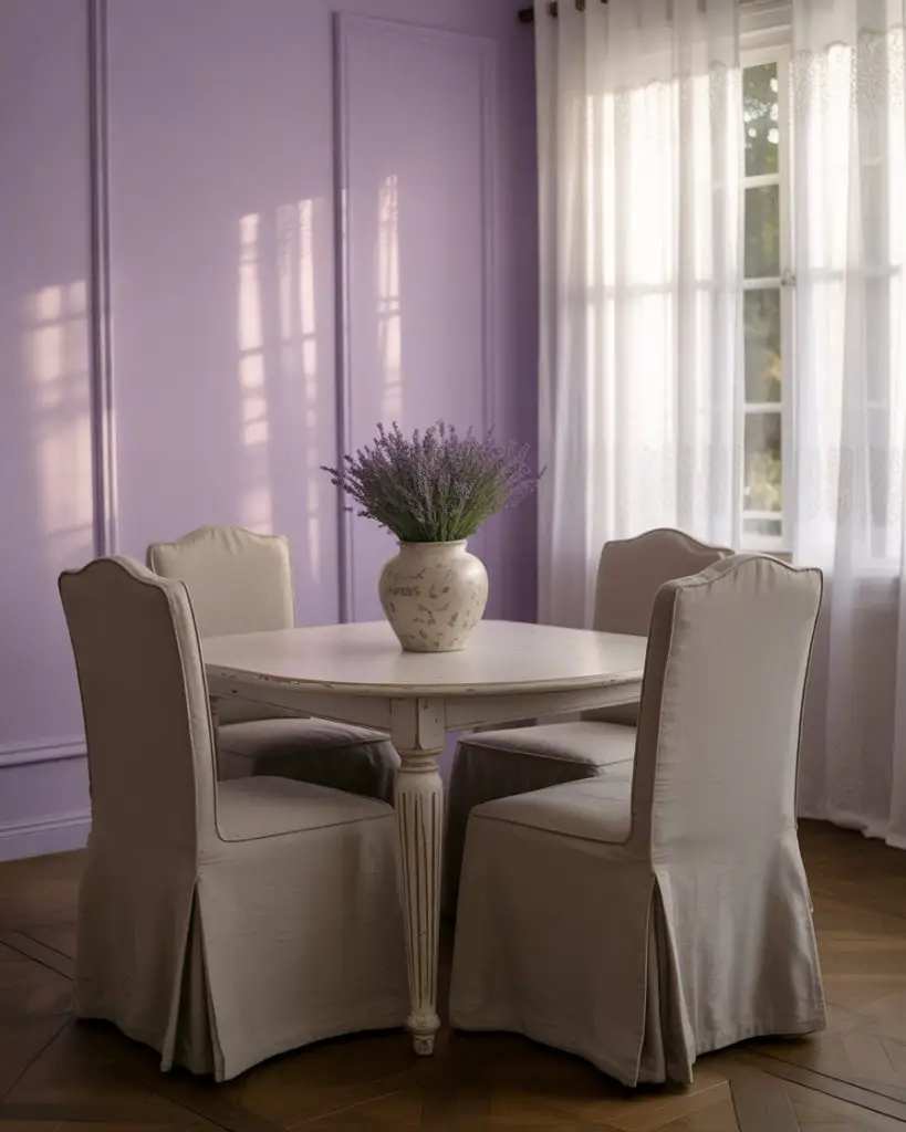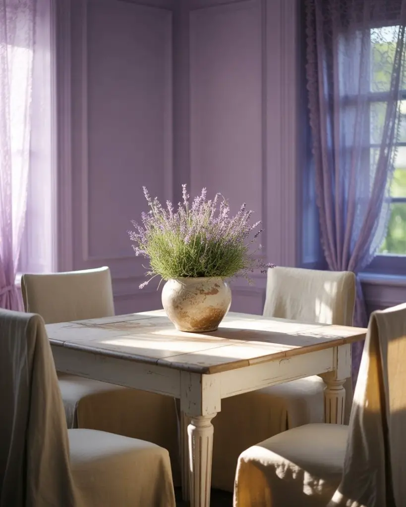For those drawn to French country charm, think soft lavender walls, a distressed white or pale gray table, and linen slipcovers on dining chairs. The palette is muted and romantic—whites, soft grays, dusty purples, and touches of sage green. Fresh flowers in simple ceramic vases and vintage-inspired candle holders add to the effortless elegance that defines this European-inspired style.