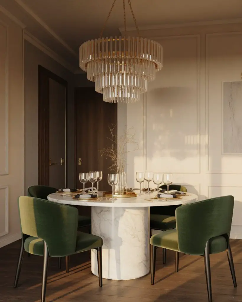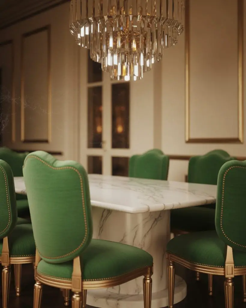 A luxury dining room in 2026 leans into rich textures and statement materials. Imagine a marble-topped table—Carrara or black marble—surrounded by velvet dining chairs in jewel tones like emerald or sapphire. Add a grand crystal or tiered chandelier, and layer in metallic accents through gold flatware, mirrored trays, or brass picture frames. It’s formal without feeling stuffy, classy without being cold.