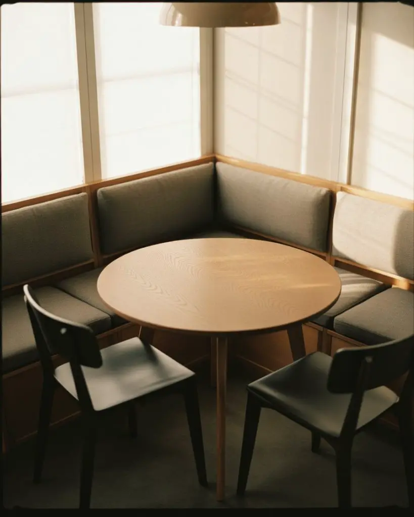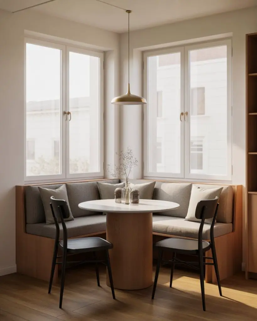 For small space dining solutions, a built-in banquette offers both seating and storage. Tuck it into a corner or along a wall, add a compact round table, and finish with a pair of modern chairs on the opposite side. Upholster the banquette in a durable fabric—linen or performance velvet—and include drawers or lift-top storage underneath for linens, extra dishes, or seasonal décor.