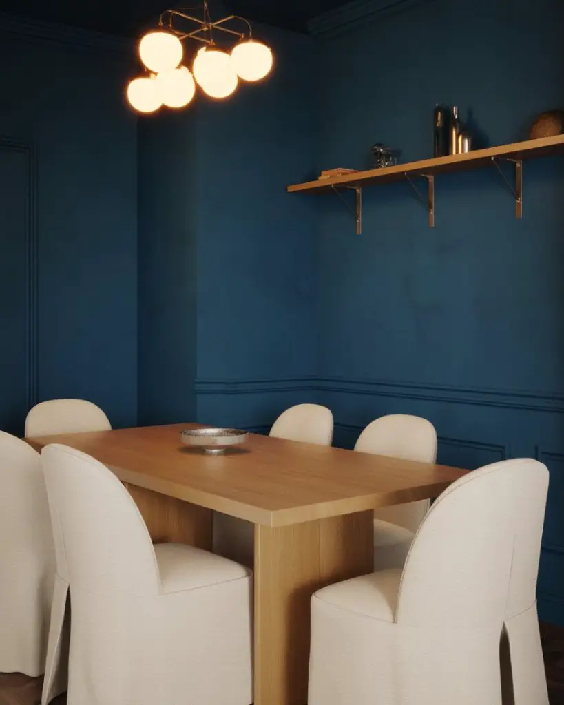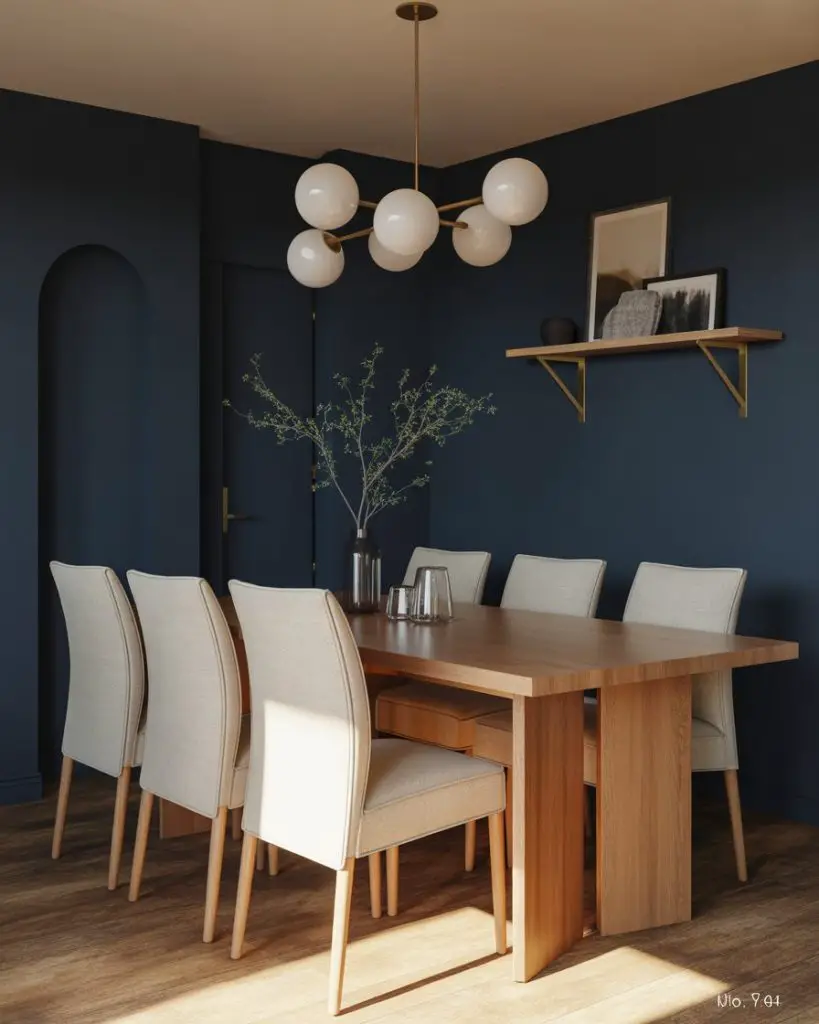 A blue dining room makes a confident statement, especially when executed in a deep navy or saturated cobalt. Paint the walls or add a blue accent wall behind a floating shelf or buffet, then introduce warm brass hardware, mirror frames, and light fixtures to balance the cool tones. Pair with a natural wood table and neutral upholstered chairs to keep the look grounded and livable.