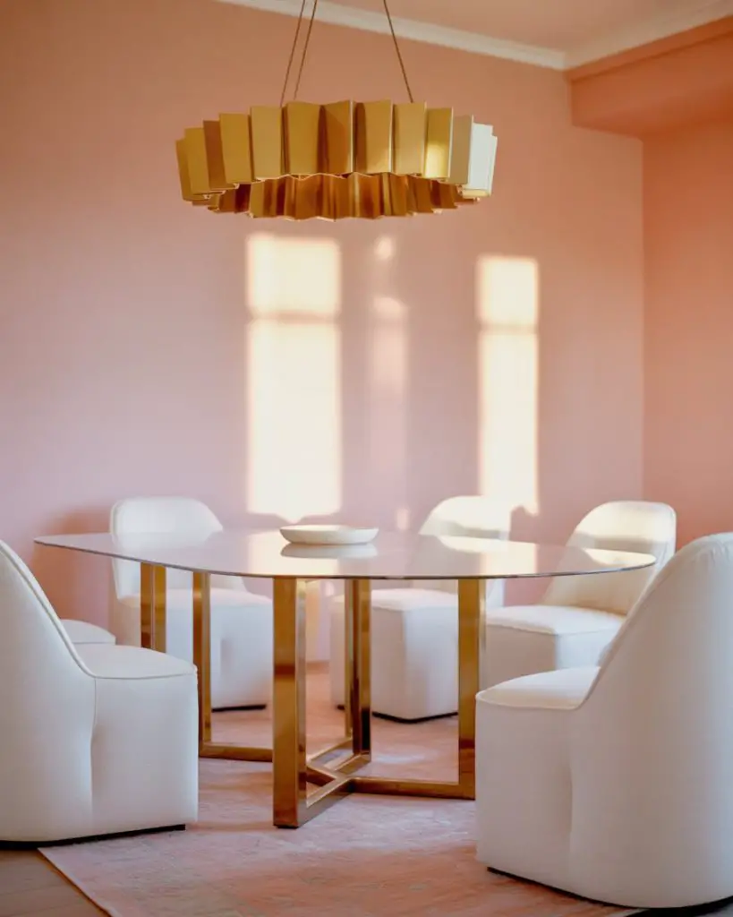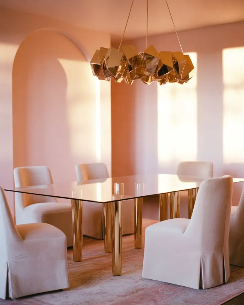 Blush pink is having a refined moment in dining rooms, especially when balanced with gold accents and soft textures. Think pale pink walls or a rose-toned area rug, paired with a glass or lucite table and gold-legged chairs. The effect is feminine without being overly sweet, modern without sacrificing warmth. Add a geometric gold chandelier and you’ve got a space that photographs beautifully and feels special in person.