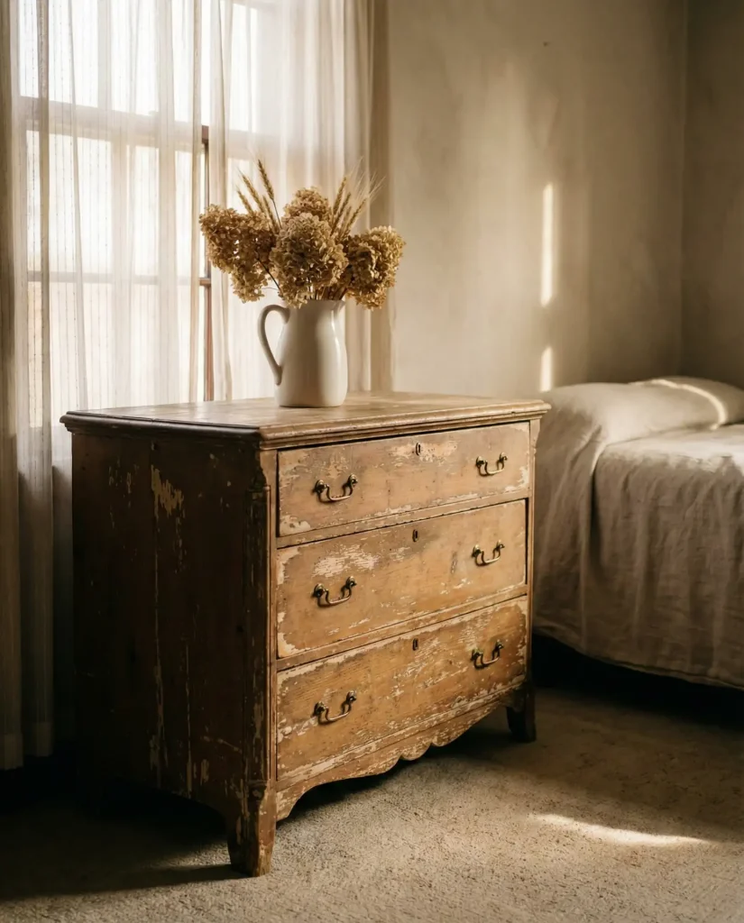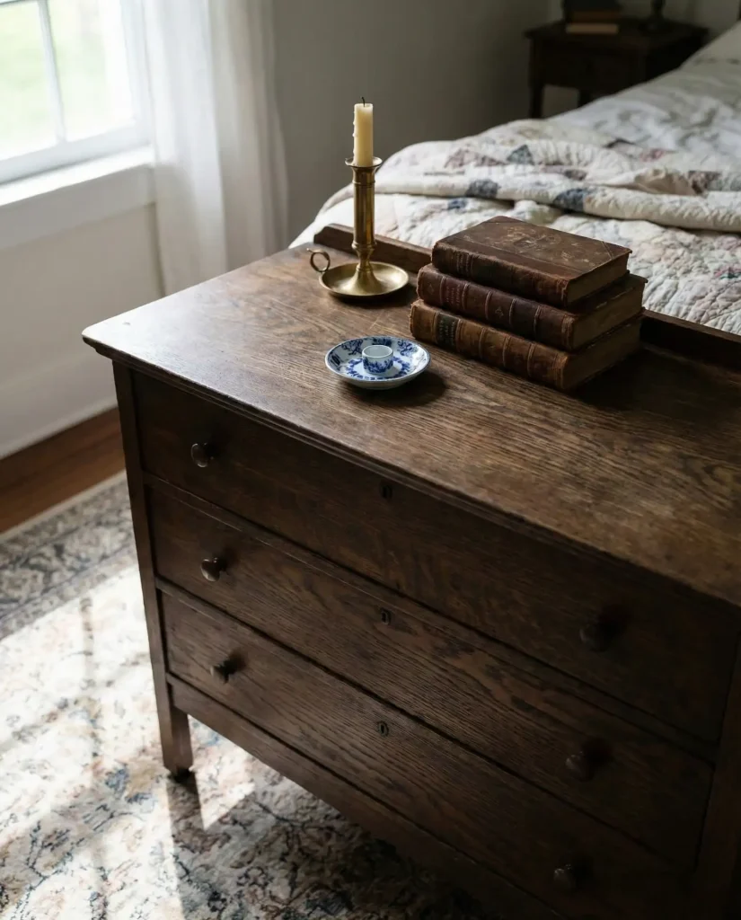 Styling an antique dresser requires a lighter touch than modern pieces—the furniture itself is the star, so your job is to enhance rather than compete with its history and character. Let the wood grain, hardware, and any wear marks shine by keeping the top simple: a single brass candlestick, a small stack of vintage books, or a weathered frame. Avoid anything too modern or plastic that would clash with the dresser’s age, and embrace the patina and imperfections that tell the piece’s story.