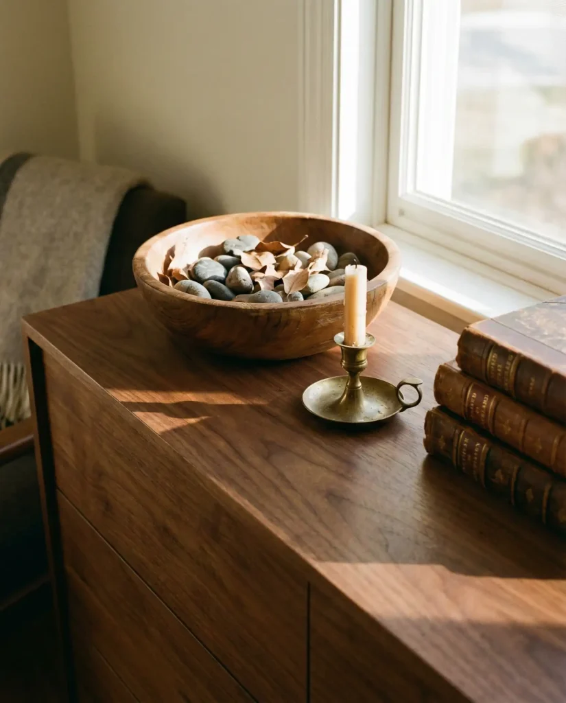 Embracing brown wood tones across your dresser and its styling—walnut finishes, teak bowls, and leather accents—creates a grounded, earthy warmth that’s become a major trend as people react against years of all-white interiors. This palette feels inherently cozy and pairs beautifully with greenery, brass, and textured textiles. Layer different wood tones rather than trying to match everything perfectly; the variation adds depth and keeps the look from feeling flat or too matchy.