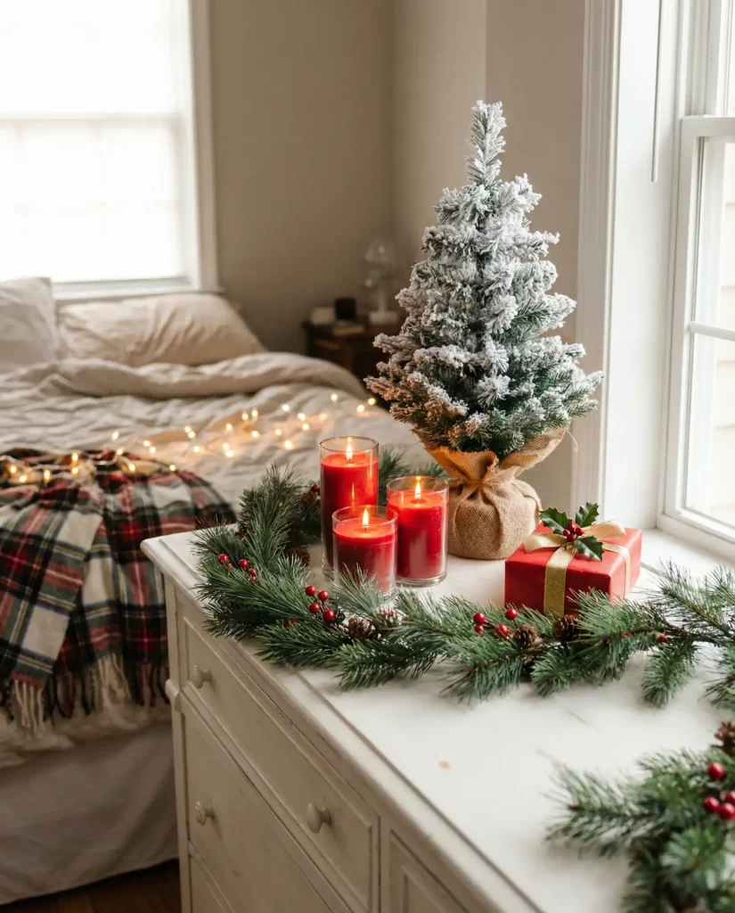 During the holidays, your dresser becomes prime real estate for a Christmas vignette that brings festive cheer without requiring a full room overhaul—think a small faux tree, candles in mercury glass, pine garland, or a bowl of ornaments. The beauty of styling a dresser for the season is that it’s self-contained and easy to swap out in January without much fuss. Stick to a consistent color palette—classic red and green, modern white and gold, or rustic wood and plaid—to keep it cohesive with the rest of your decor.