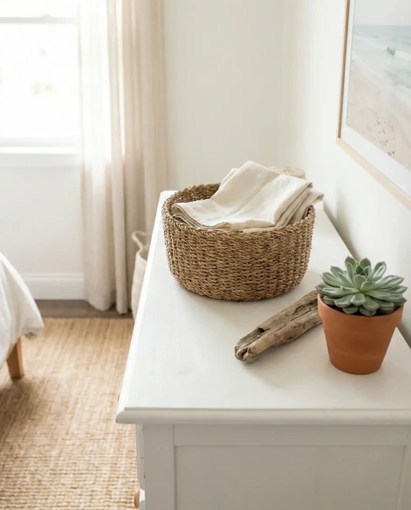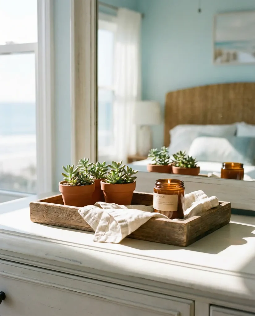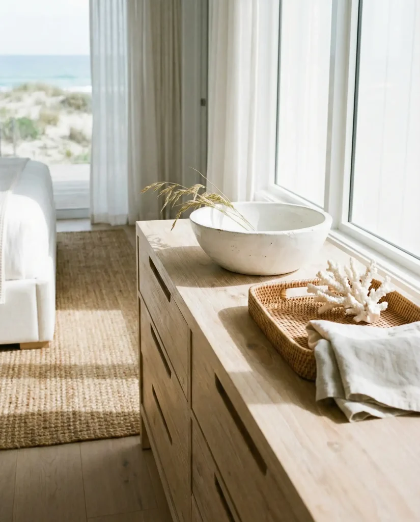 Layering rattan, driftwood, linen, and ceramic in sandy neutrals brings that breezy coastal feeling to your dresser, no ocean required—this look has taken off nationwide as Americans crave calm, airy interiors that feel like a permanent vacation. Think woven baskets, bleached wood frames, a linen runner, or a ceramic bowl in soft cream. The textures do the talking here, so you don’t need bold color to make an impact. Pair it with a few shells or smooth stones if you want to lean into the theme without crossing into kitsch.
