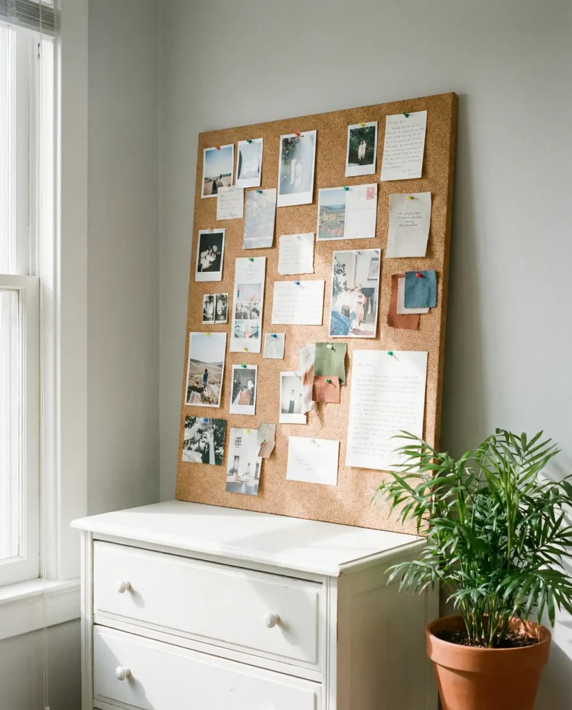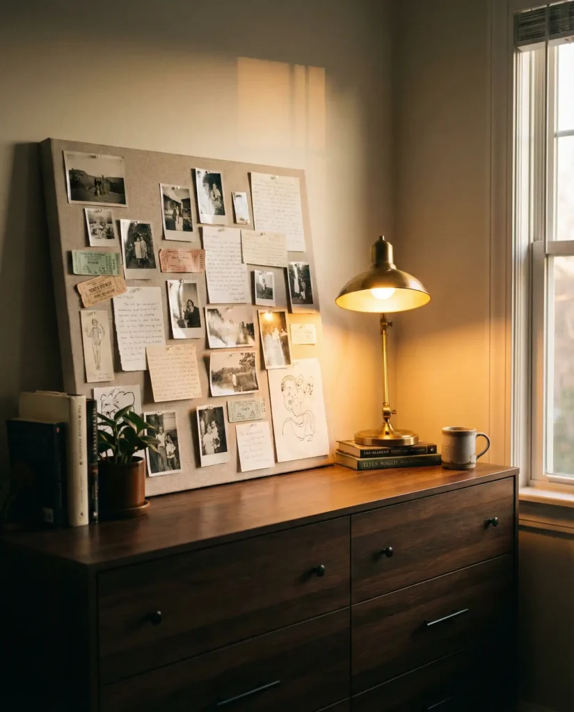 Expert-style commentary: vision boards have been scientifically shown to improve goal achievement and motivation when placed in high-visibility areas you see daily. Your dresser is prime real estate for this—you pass it every morning and night, reinforcing the images and intentions you’ve curated. It’s part decor, part life coaching tool, and it’s one of the few styling choices that actively serves your personal growth alongside aesthetics.