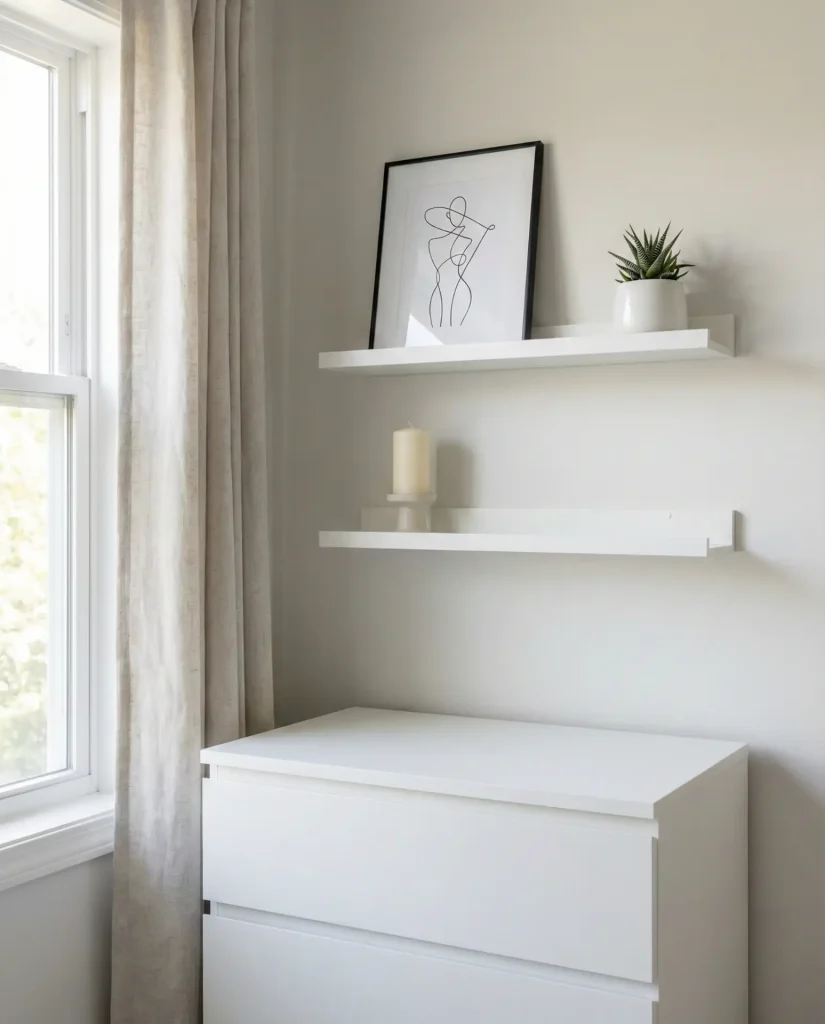 Installing two or three slim floating shelves directly above your dresser multiplies your display real estate while maintaining an airy, open feel that’s perfect for modern and minimalist bedrooms. This setup allows you to layer books, small plants, framed photos, and decorative objects in a way that feels curated rather than cramped. Choose shelves in a finish that either matches your dresser or contrasts it intentionally—natural wood against a white dresser, or black metal brackets for an industrial edge.