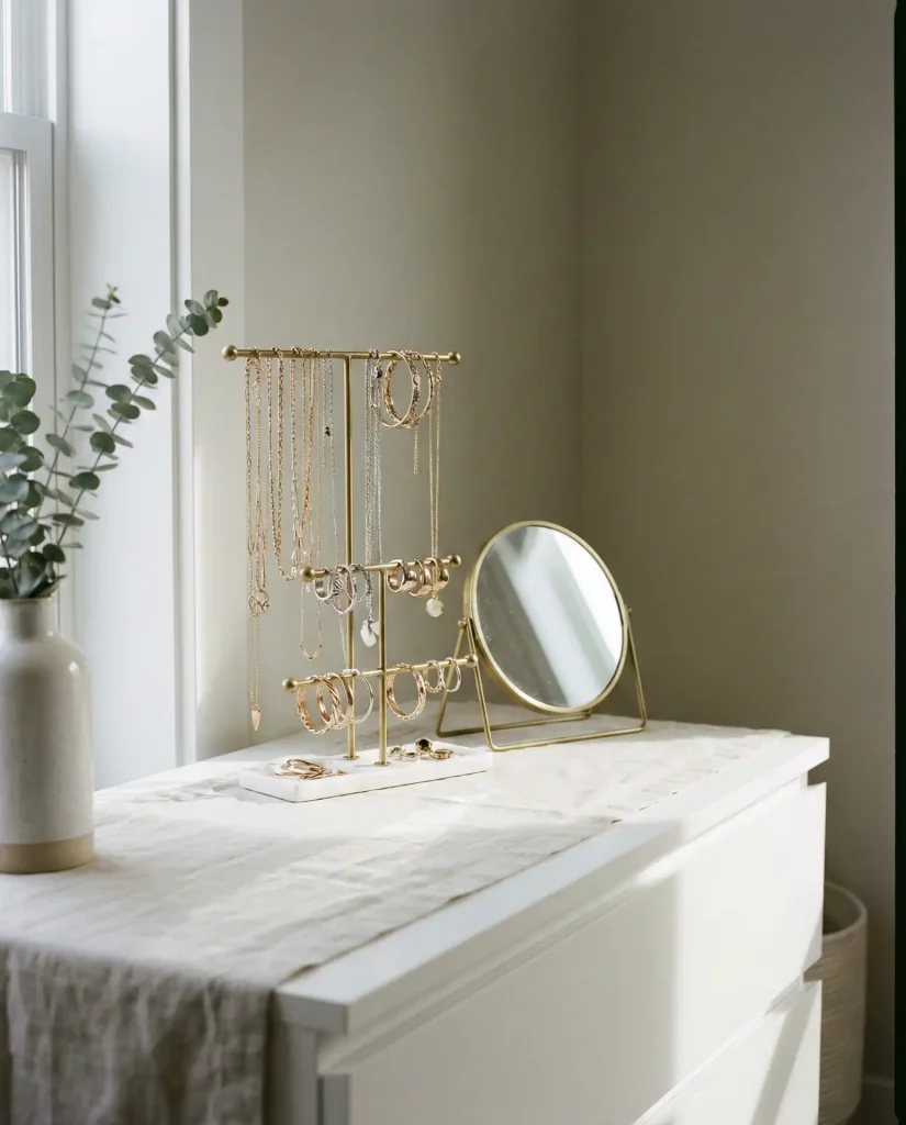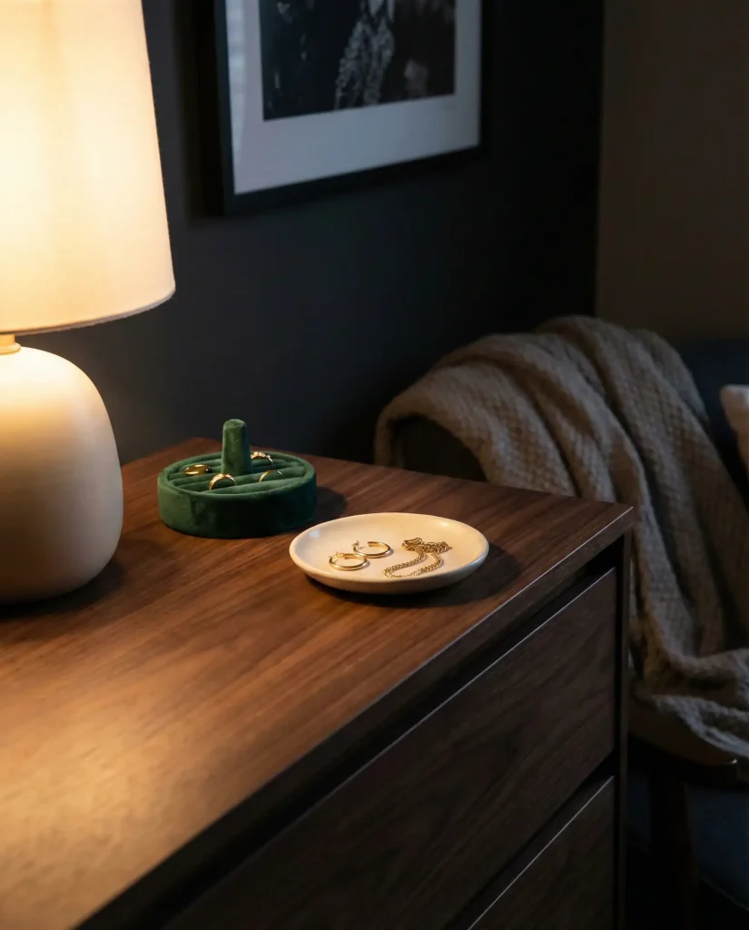 Expert stylists often recommend the “edit and rotate” method: keep only your current favorites on display and store the rest in a drawer to avoid visual overwhelm. This prevents your dresser from looking like a jewelry store exploded and ensures each piece gets its moment to shine. It’s also a gentle reminder to wear what you love rather than letting beautiful things gather dust in a forgotten box.